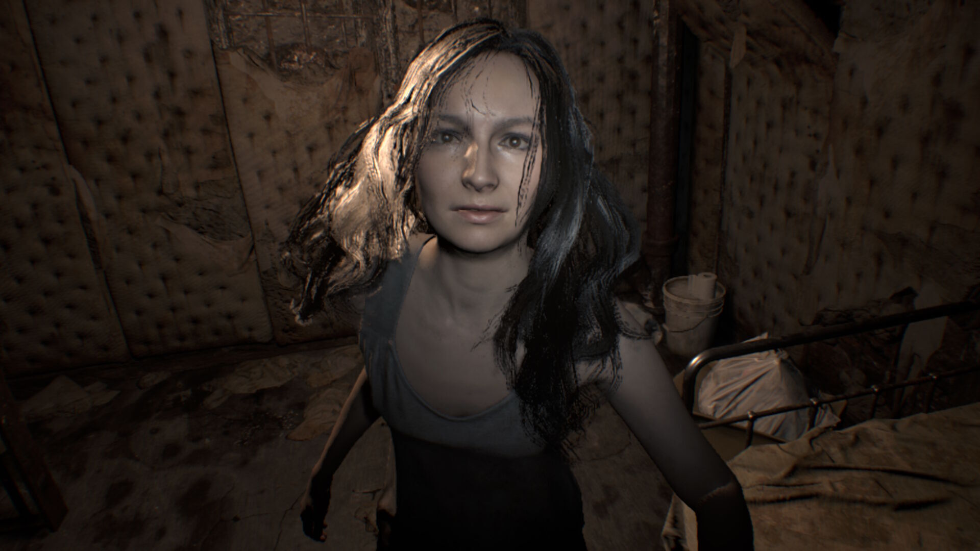 Lo que más canta es lo mismo que hemos visto en los tráileres de Requiem para Switch 2 y en la demo de Pragmata. El RE Engine tiene una tecnología especial para que el pelo se comporte de manera natural. Una tecnología que parece llevarse mal con las limitaciones de la consola de Nintendo y con las tecnologías de reescalado. Cuando Ethan se encuentra con Mia al principio de esta pesadilla, el fallo sale a relucir.