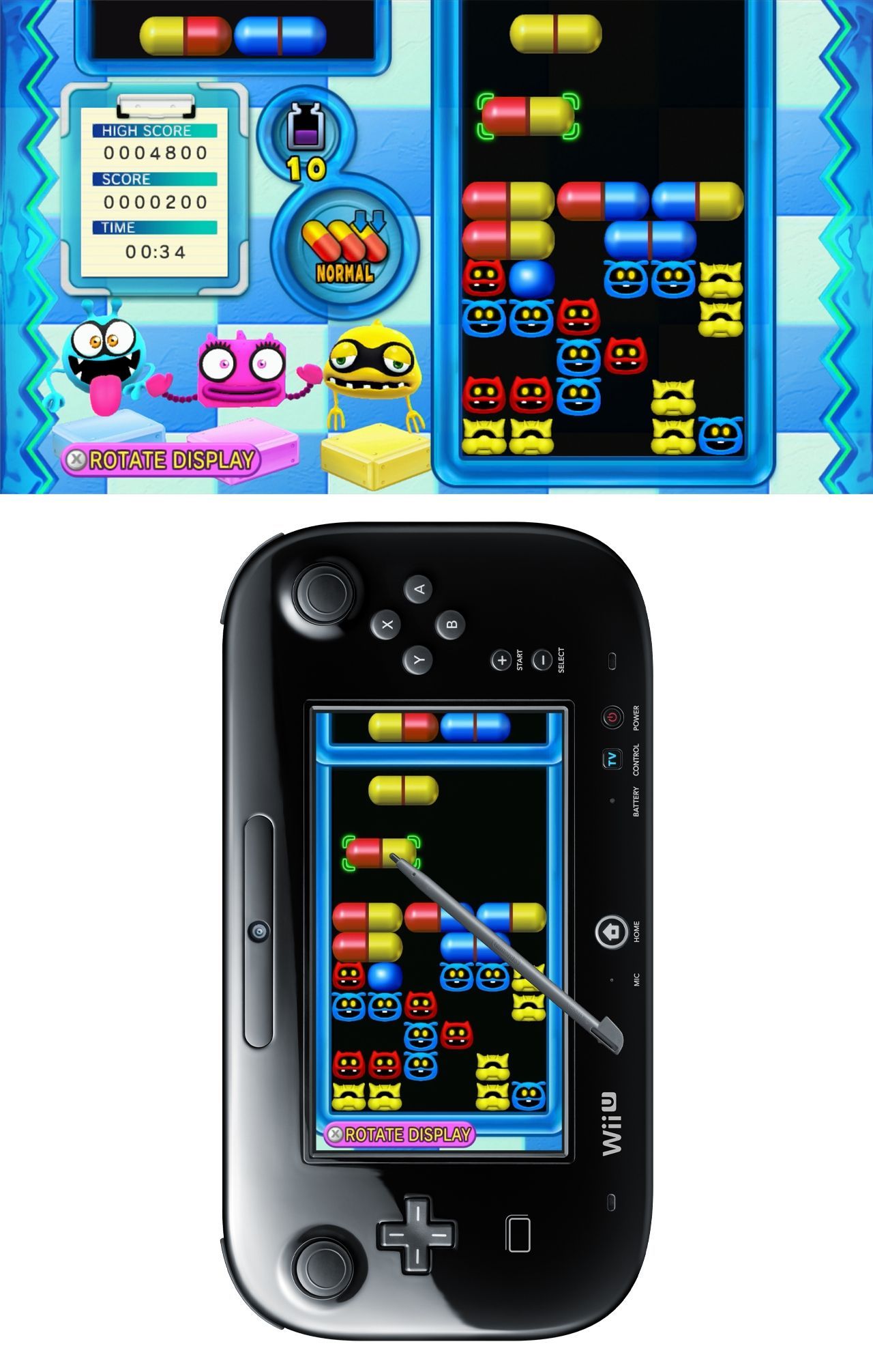 Además de Retroterapia y L de Luigi, que en lo único que se diferencian es en la forma de las cápsulas, tenemos Bactericida, un nuevo modo que se juega en la pantalla táctil del GamePad con el lápiz. Podemos situar el mando en vertical u horizontal, como más nos guste, y tenemos que mover las cápsulas arrastrándolas y girándolas pulsando en la pantalla. Aunque en un principio esto no parece ninguna novedad, pronto descubrimos que pueden caer dos o tres cápsulas a la vez, lo que cambia la jugabilidad bastante. De hecho también podemos mover los fragmentos que caen al hacer una combinación, por lo que se crean nuevas estrategias. A la hora de la verdad, este es el modo más novedoso y fresco.