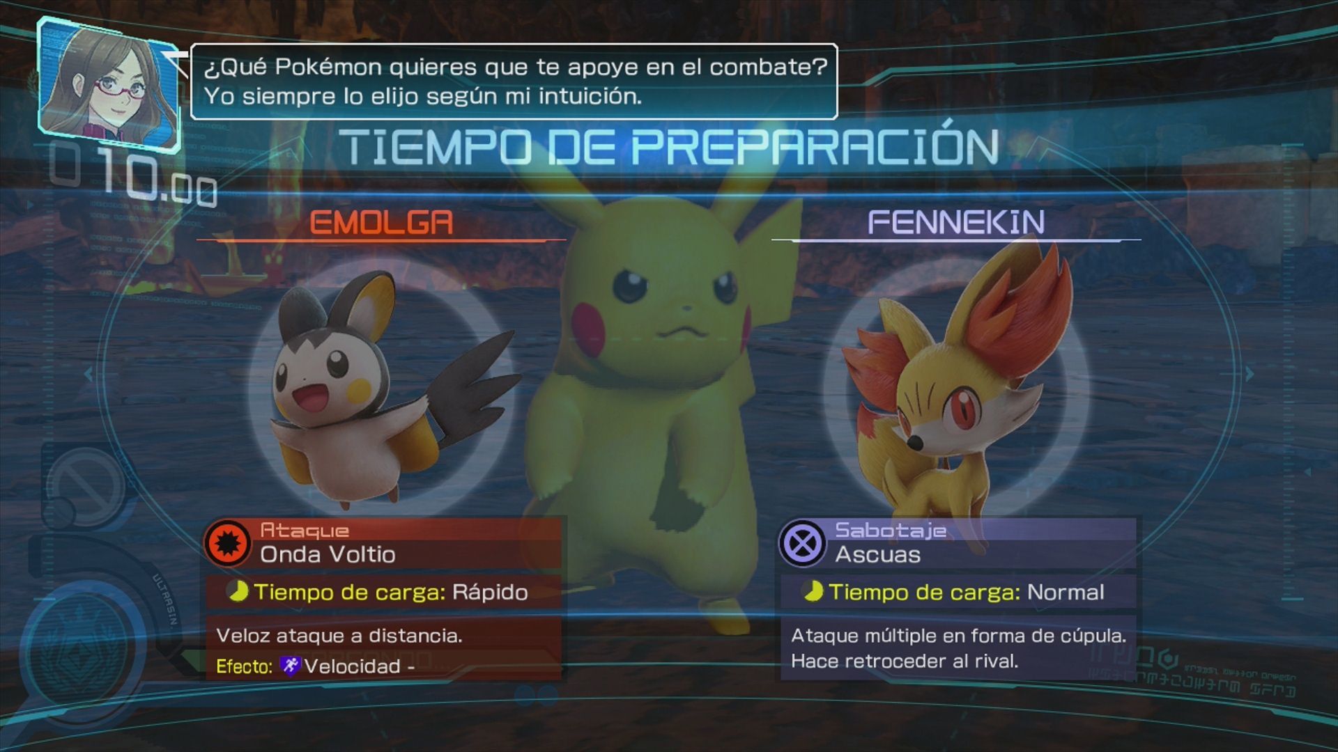 En cuanto a los personajes de apoyo, existen varios equipos de dos Pokémon de apoyo entre los que podremos escoger (están predefinidos), aunque en cada round tendremos que decidirnos por una única criatura. Su funcionamiento es exactamente el mismo que hemos visto en otros juegos de lucha: aparecen en el escenario cuando los llamamos, ejecutan su movimiento y se van, obligándonos a esperar el tiempo de recarga para volverlos a invocar. Sus efectos son variadísimos, y pueden consistir en ataques directos, técnicas para entorpecer a nuestro rival con estados alterados o simplemente técnicas de apoyo que nos potencien de diversas formas y hasta nos curen. Dependiendo del Pokémon escogido, necesitará más o menos tiempo de recarga, aunque por lo que hemos jugado, raro será que nos dé tiempo a invocarlos más de una vez en un round.