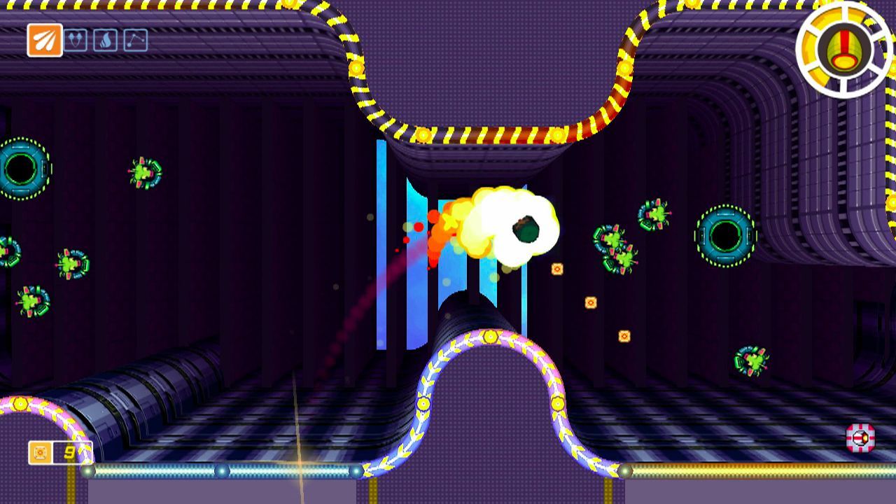 El componente de shooter es igualmente original. A pesar de lo que podáis intuir por las pantallas, no es un twin-stick shooter, sino que disparamos siempre en perpendicular a la superficie a la que estemos adheridos. Así, tenemos que conseguir colocarnos en frente del enemigo para que nuestros disparos vayan dirigidos a él, y nos veremos saltando, esquivando y haciendo virguerías para conseguir salir airosos del ataque.