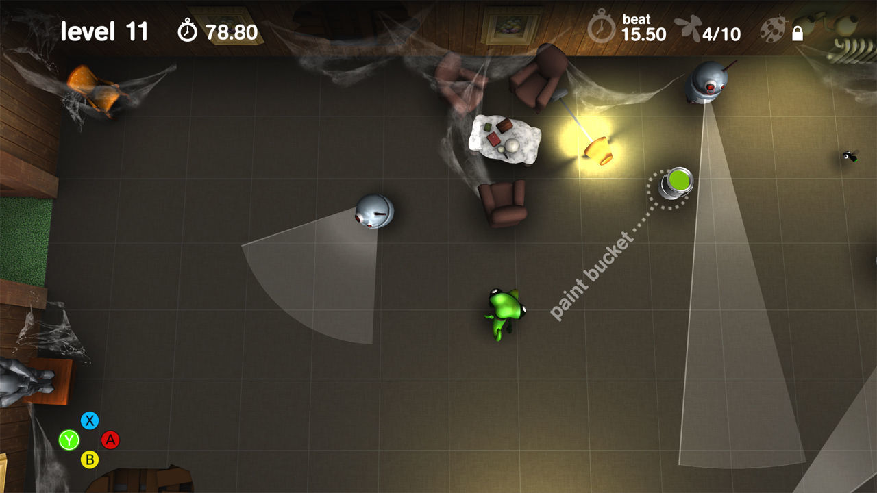 Mientras nos movemos por los niveles, el camaleón puede cambiar de color a su voluntad escogiendo entre cuatro colores. Para cambiar de color basta con pulsar uno de los botones frontales del mando (A, B, X o Y) que se corresponden con verde (el color base), rojo, azul y amarillo. De este modo, si pasamos por una alfombra azul, volvernos azules nos hará invisibles a los ojos de los sistemas de vigilancia. Todo ello mientras esquivamos robots, ratas y todo tipo de obstáculos. Y todavía hay más: también habrá que interactuar con múltiples elementos del escenario para conseguir avanzar, por ejemplo bloqueando rayos.