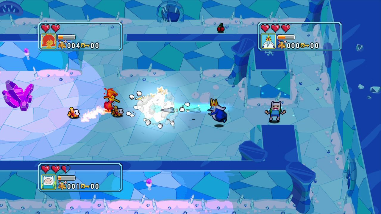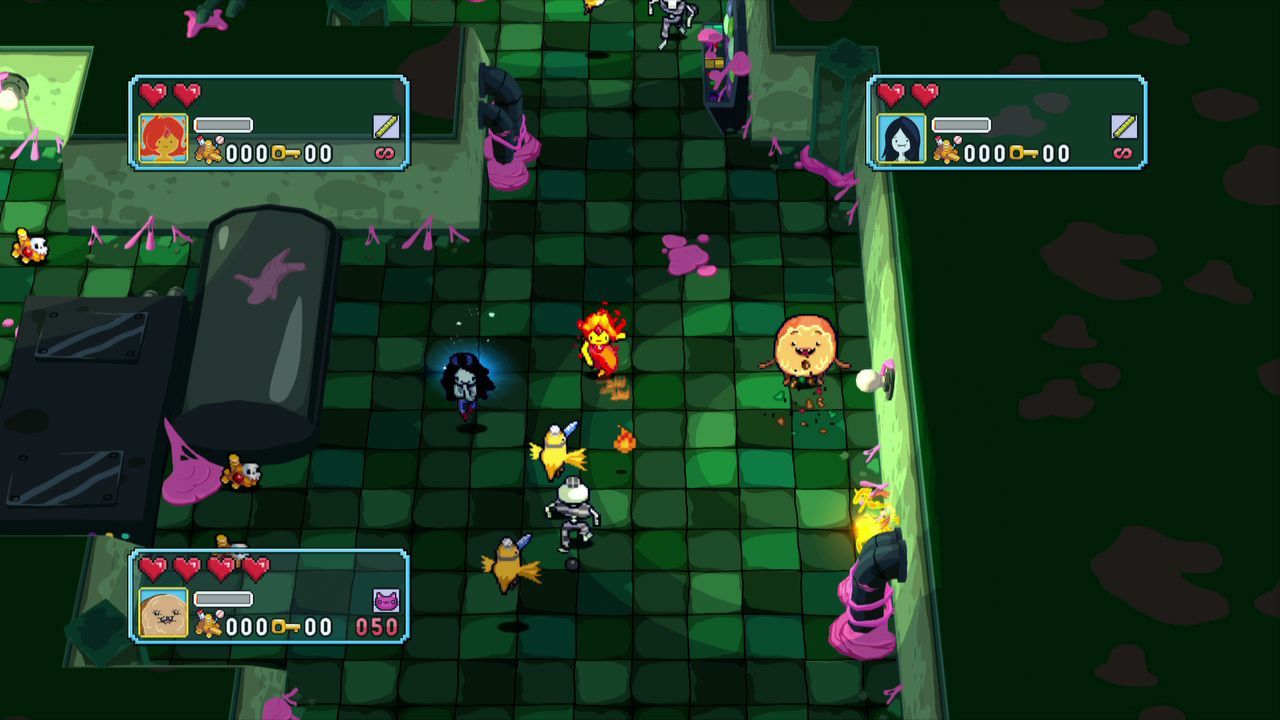 Para darle algo más de interés, cada uno de los personajes del juego tiene sus propias características especiales, de forma que por ejemplo Marceline puede volar sobre los acantilados y comerse proyectiles rojos en vez de defenderse, mientras que la Princesa Llama cuenta con poderosos ataques a distancia y es (evidentemente) inmune al fuego. Lo cierto es que la experiencia de uno a otro varía sensiblemente y a la hora de jugar en cooperativo se compenetran muy bien entre ellos, lo que no quita que hagamos prácticamente lo mismo desde el primer piso hasta el último.