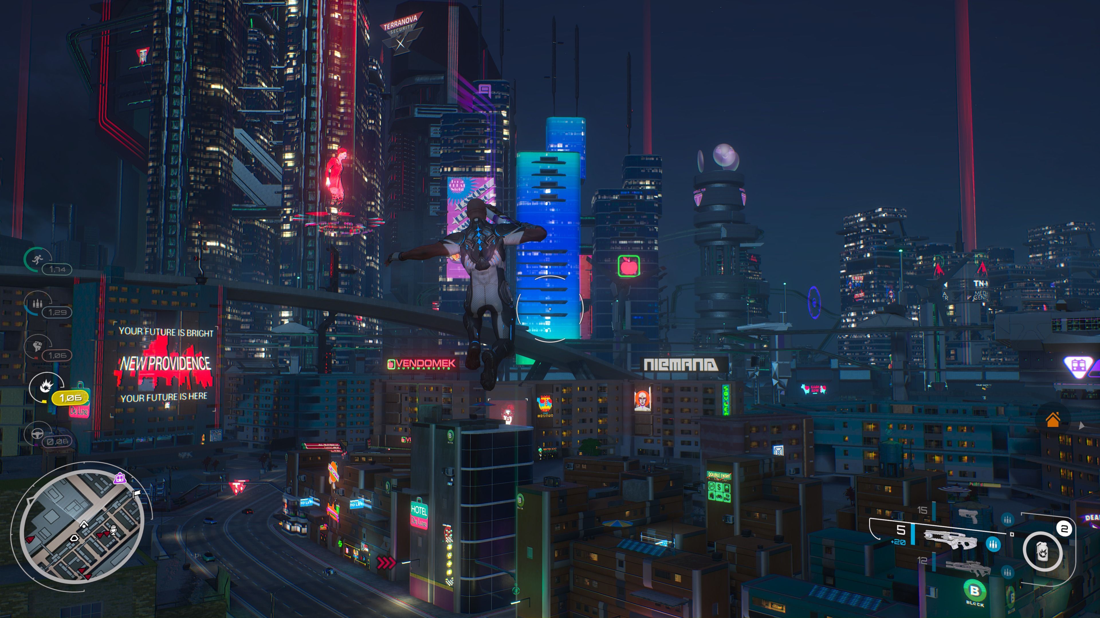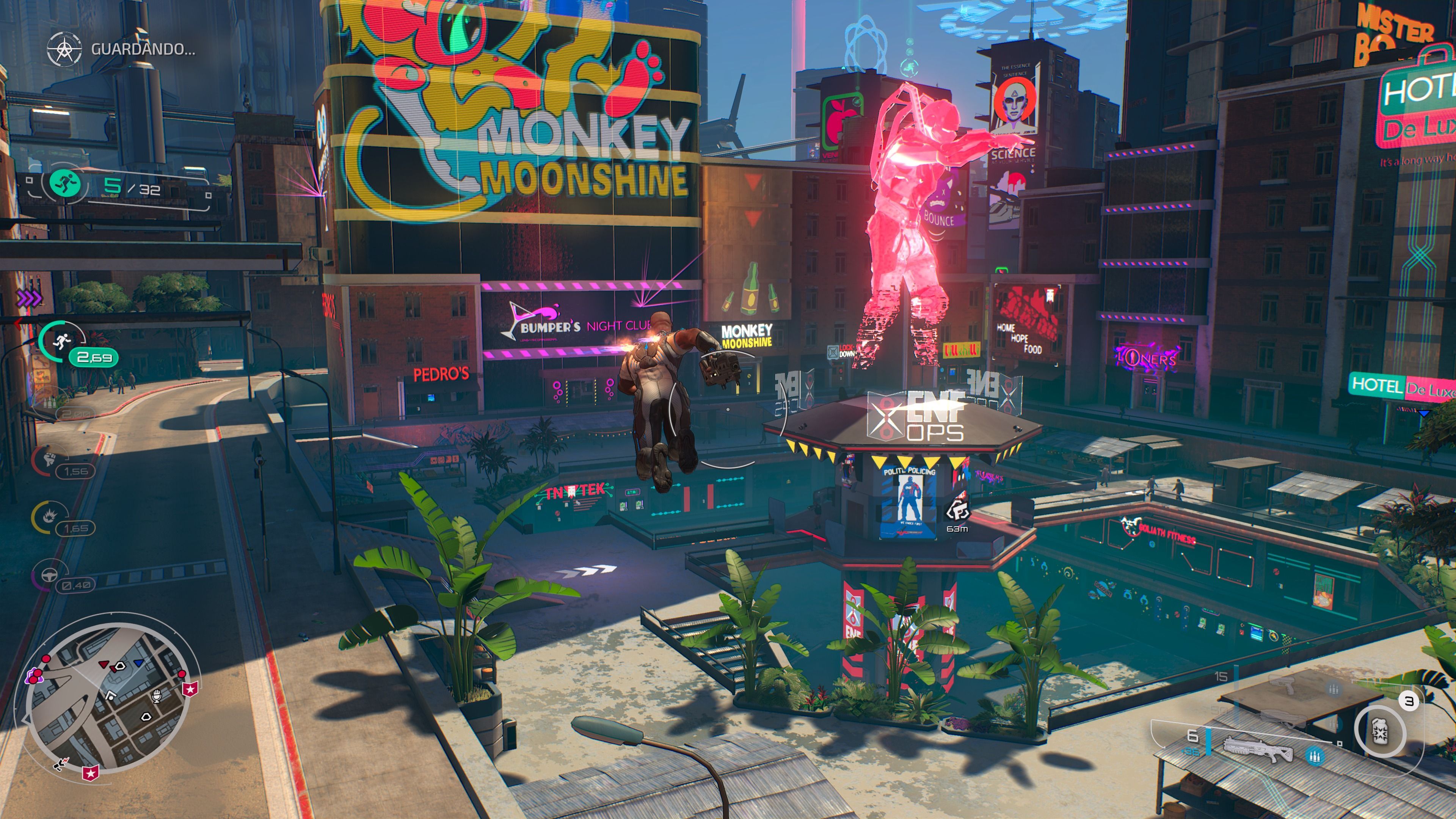Quizás donde más destaca es en su apartado artístico, con unos escenarios que mezclan rascacielos y barrios pobres, todo envuelto en luces de neón que le dan bastante personalidad. Además, por la noche y en HDR nos deja algunos momentos muy vistosos, gracias al contraste de sus coloridos carteles y la oscuridad de la noche. Por supuesto, no podemos olvidarnos de esos espectaculares momentos en los que todo empieza a explotar, marca de la saga.