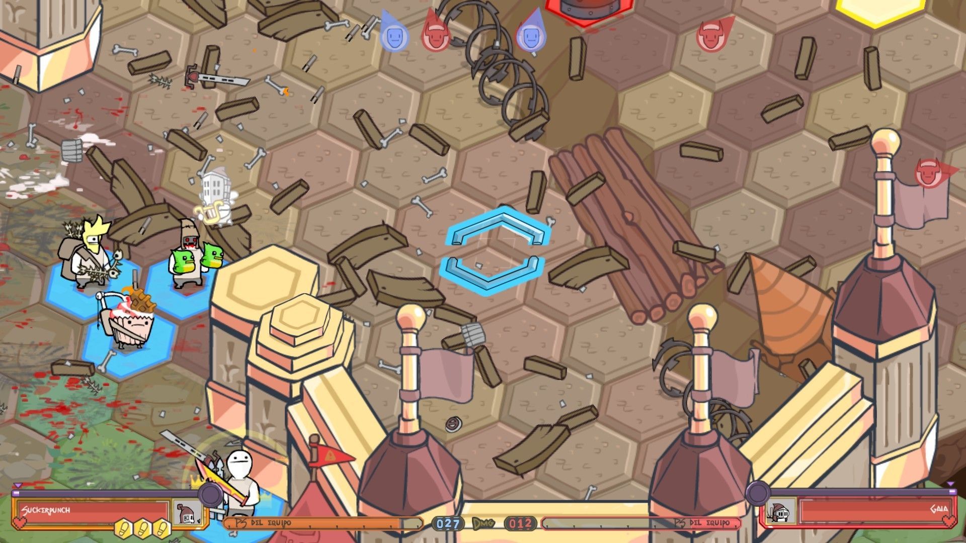 Hay profundidad en otros aspectos, como la creación de los personajes y la formación de un grupo equilibrado –determinadas armas son más efectivas contra un tipo de protección enemiga, por ejemplo una maza es más práctica contra rivales con casco que la espada-, pero si buscas un sistema tan complejo como el de los SRPG –ataques combinados, diferentes alturas en el terreno, formaciones, etc.- Pit People no lo da, ni es su pretensión. A cambio, presenta algún objetivo extra en las partidas, como atrapar al último enemigo en pie, que es un a misión extra con la que engrosar nuestra plantilla de personajes.