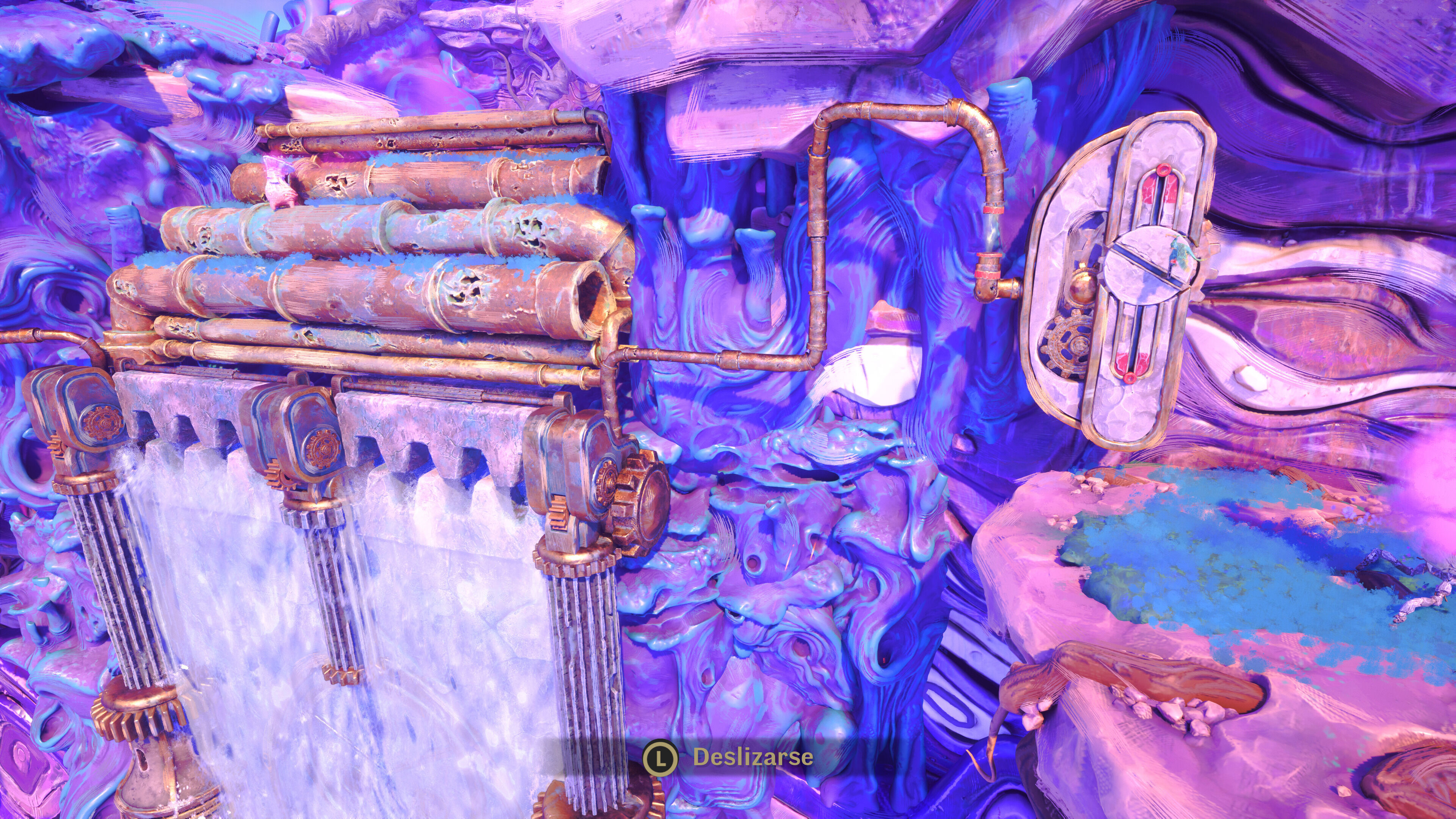 Esto, que puede parecer algo que limite el juego o lo haga repetitivo, es exactamente todo lo contrario. Double Fine viene a demostrar que le sobran ideas y que, de nuevo, como los videojuegos clásicos, no necesita todos los botones del mando y tres árboles de habilidades para ofrecer sensación de progresión y sorprender al jugador. No os vamos a contar nada más allá de que, según progresamos, iremos desbloqueando nuevas maneras de movernos. Por ejemplo, al avanzar un poco llegaremos a una zona en la que hay como una especie de nube de algodón de azúcar que nos hace más ligeros, permitiéndonos movernos con más agilidad e incluso flotar y planear en el aire. Por supuesto, los escenarios se van ajustando a estos cambios para ofrecernos nuevos desafíos.