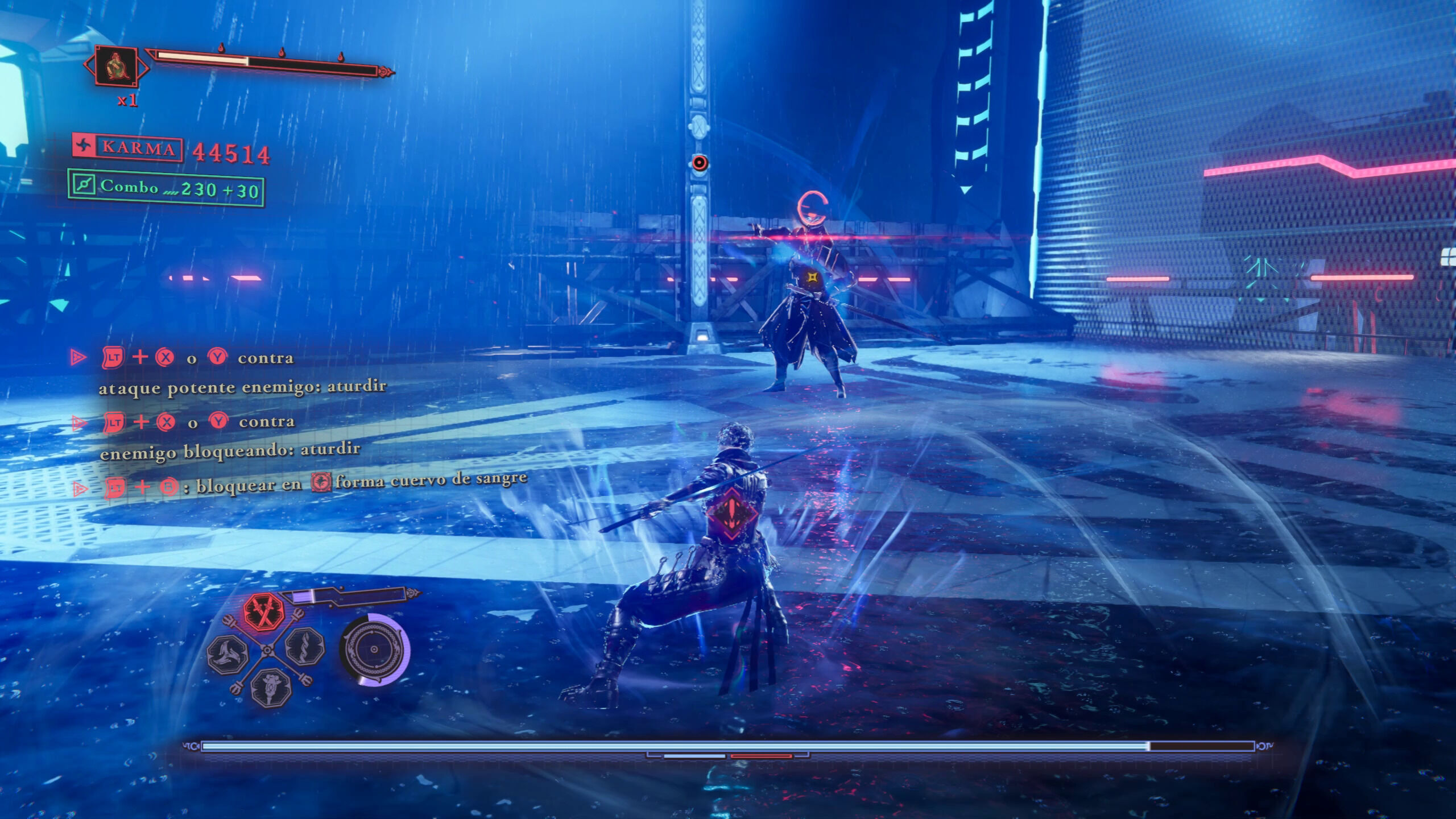 Aparte de todo esto, hemos de contaros una habilidad muy importante, conocida como la posición Cuervo de Sangre. Esta permite a Yakumo potenciar sus ofensivas normales para, principalmente, dejar expuestos a enemigos con escudo. Es una acción más poderosa, que depende de un indicador de energía y por tanto no se puede usar sin límites. Emplearla con cabeza es otra de las claves para triunfar en Ninja Gaiden 4, junto a una técnica especial que se activa conforme causamos y recibimos ataques, la cual si usamos con precisión puede acabar de un plumazo con todos los enemigos que veamos en pantalla.