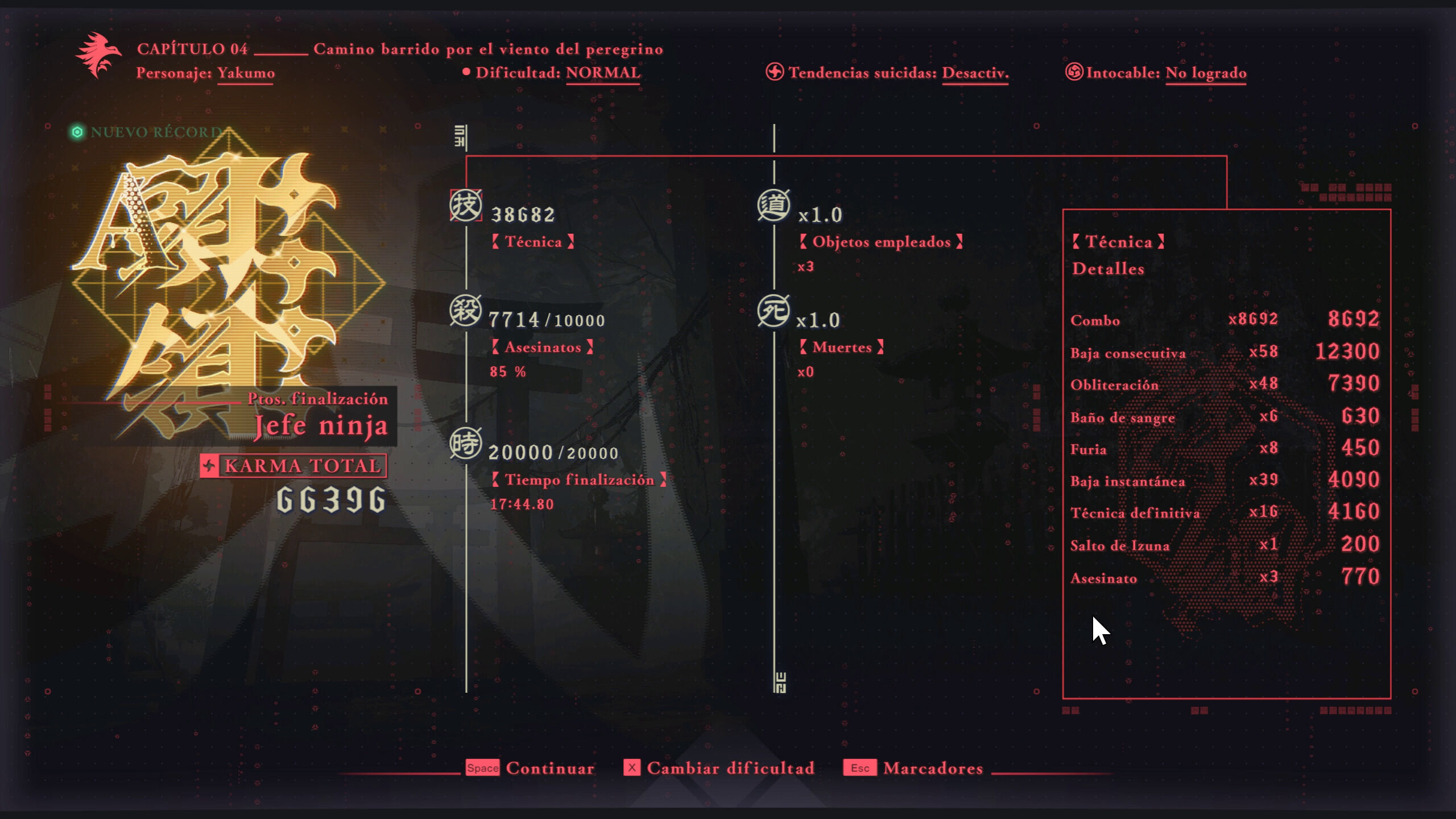 Otro aspecto de vital importancia está en la duración de la campaña. A nosotros nos ha durado entre 14-15 horas en una primera vuelta, completando unas cuantas misiones secundarias y parándonos en algún que otro purgatorio. Para un jugador completista esa duración será algo más elevada, y eso sin contar con lo interesante que resulta en este tipo de juegos volver a repetir la aventura con un desafío mayor. A este respecto, la dificultad Maestro Ninja se desbloquea al superar el juego por primera vez, ofreciendo un reto mayúsculo en que estás muerto tras unos pocos golpes.