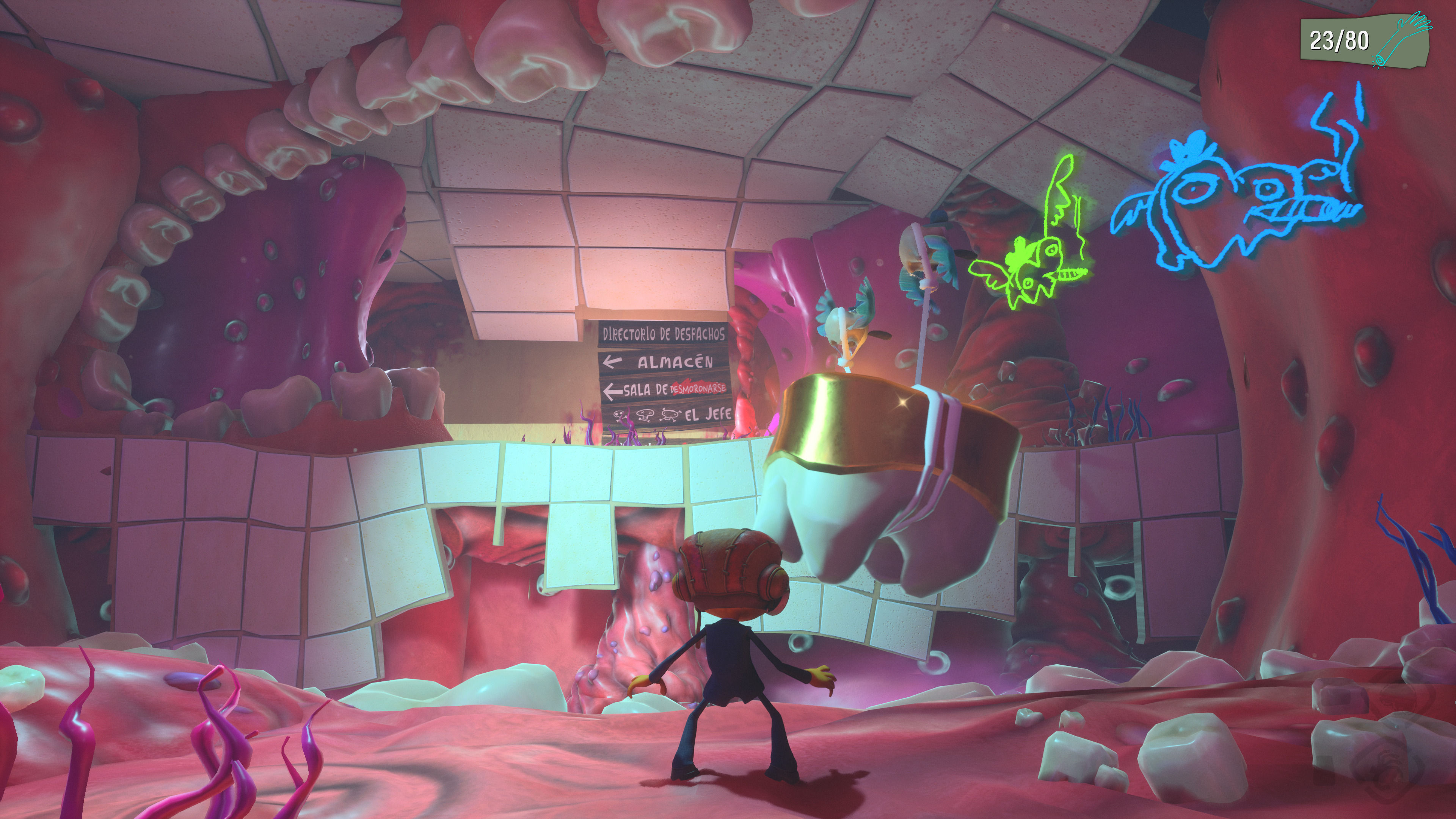 Psychonauts 2 técnicamente es un juego discreto, no cuenta con grandes texturas, complejos modelados ni elaborados efectos gráficos, pero en lo artístico es sobresaliente, y eso hace que sea por momentos muy bonito, incluso espectacular en ocasiones, especialmente los jefes finales. El hecho de que cada nivel, cada mente en la que nos sumergimos, sea completamente distinto, lo aprovechan para todo tipo de ideas visuales, incluso para cambiar de estilo gráfico. La expresividad de los personajes y las cinemáticas también están muy cuidadas, algo importante teniendo en cuenta su fuerte carga narrativa.