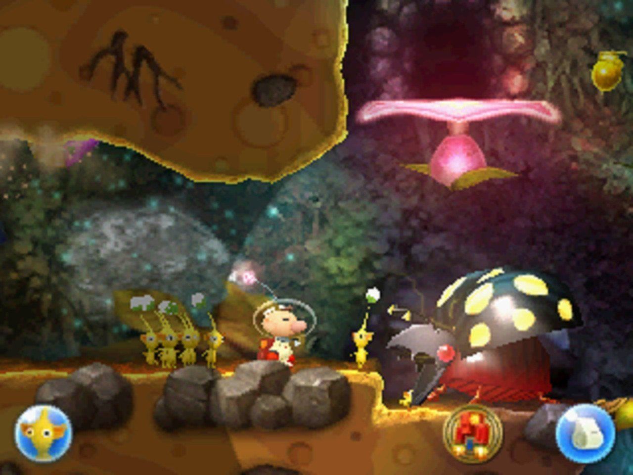 Quizás cueste un poco más hacerse con el hecho de que las dos pantallas se convierten en una sola. El juego utiliza únicamente el botón deslizante (o los botones A, B, X e Y) para mover a Olimar y el lápiz para marcar dónde quieres enviar a los pikmin y seleccionar la mochila o el silbato. La pantalla superior queda en parte para mostrar el mapa (de forma opcional) y para ver más del escenario.