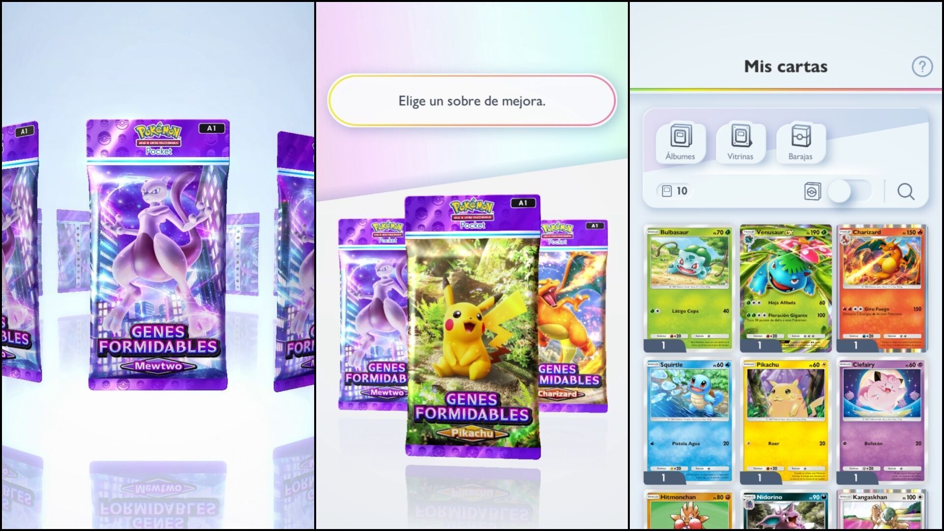 Porque si algo destaca de JCC Pokémon Pocket es la sensación, el game feel podríamos decir, que tiene el simple hecho de abrir un sobre. No están en una tienda ni en ningún menú, sino en primer plano: el espacio de los sobres es el más grande de la pantalla de inicio. Ahí están los tres diferentes de la única colección actual, Genes Formidables. Hay mucha ceremonia al abrirlos. Al seleccionar uno, una estilosa animación pone en la pantalla un puñado de sobres de los elegidos en un círculo: podemos rotarlo, girar el sobre y manosearlo, algo tan innecesario que llevó a que durante unos días surgieran en internet bulos sobre que ciertos sobres con las esquinas dobladas tenían mejoras cartas.