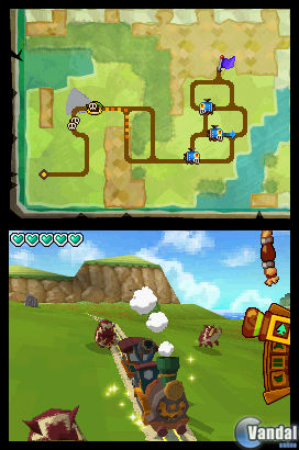 Finalmente, la parte más llamativa pero al mismo tiempo la que menos nos ha gustado: Link tiene un tren por el que moverse por el mundo, repleto de vías. El tren se controla de forma sencilla, contando con una palanca a la derecha que podremos mover para marcar las velocidades a las que tiene que ir, e incluso para dar marcha atrás. La complicación viene de los animales que se crucen en la vía, que tendremos que ahuyentar tirando de la cadena para tocar la bocina, y de los numerosos enemigos que se reunirán a los lados para lanzarnos bombas, que pueden acabar con nuestra bonita locomotora. Por suerte, estamos armados con un cañón y, moviendo la cámara con la pantalla táctil, tenemos una visión de 360 grados para lanzarles nuestras propias bombas y así evitar que acaben con nosotros.