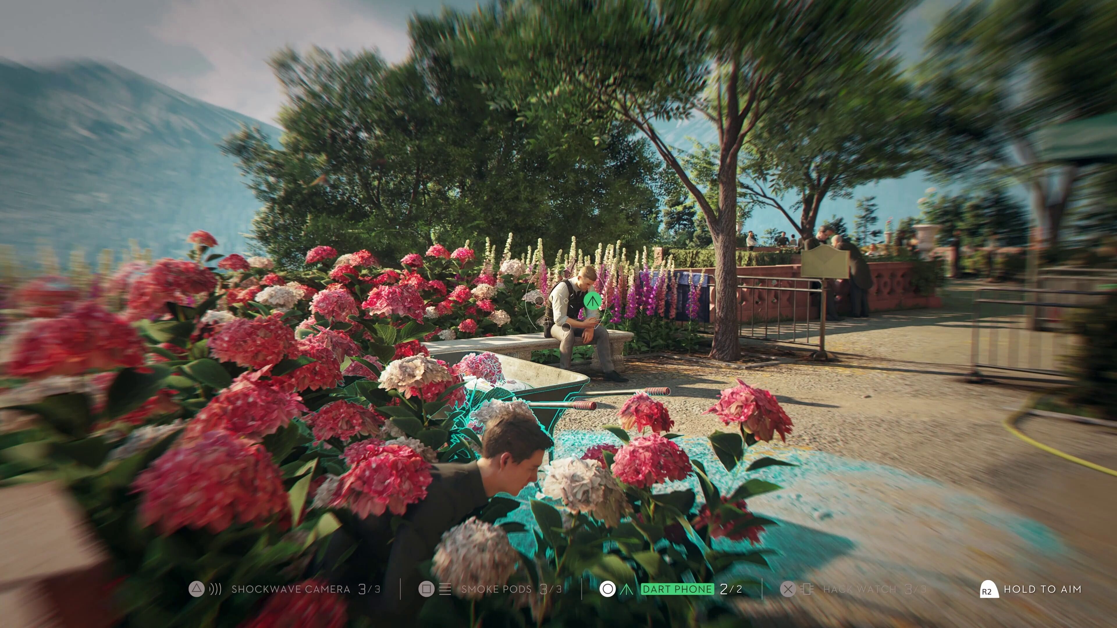 Con la ayuda de su versátil reloj, Bond puede analizar el entorno para identificar caminos y encontrar elementos interactivos. Una ventana abierta parece el sitio ideal por el que adentrarse en el edificio, pero para llegar hasta ella hay que distraer a un guardia. Cerca de su posición hay una carretilla con hojas secas, perfecta para crear una distracción. El agente 007 activó una manguera que mojó a otro guardia que estaba fumando. Cuando este fue a apagarla, le disparó un dardo que le provocó malestar y le hizo alejarse para vomitar, momento que aprovechó para robar el mechero que había dejado en el borde de la fuente donde se sentaba. El encendedor le sirvió para prender las hojas, que distrajeron al otro guardia, y así pudo encaramarse por el edificio sin ser detectado a causa de la conmoción.