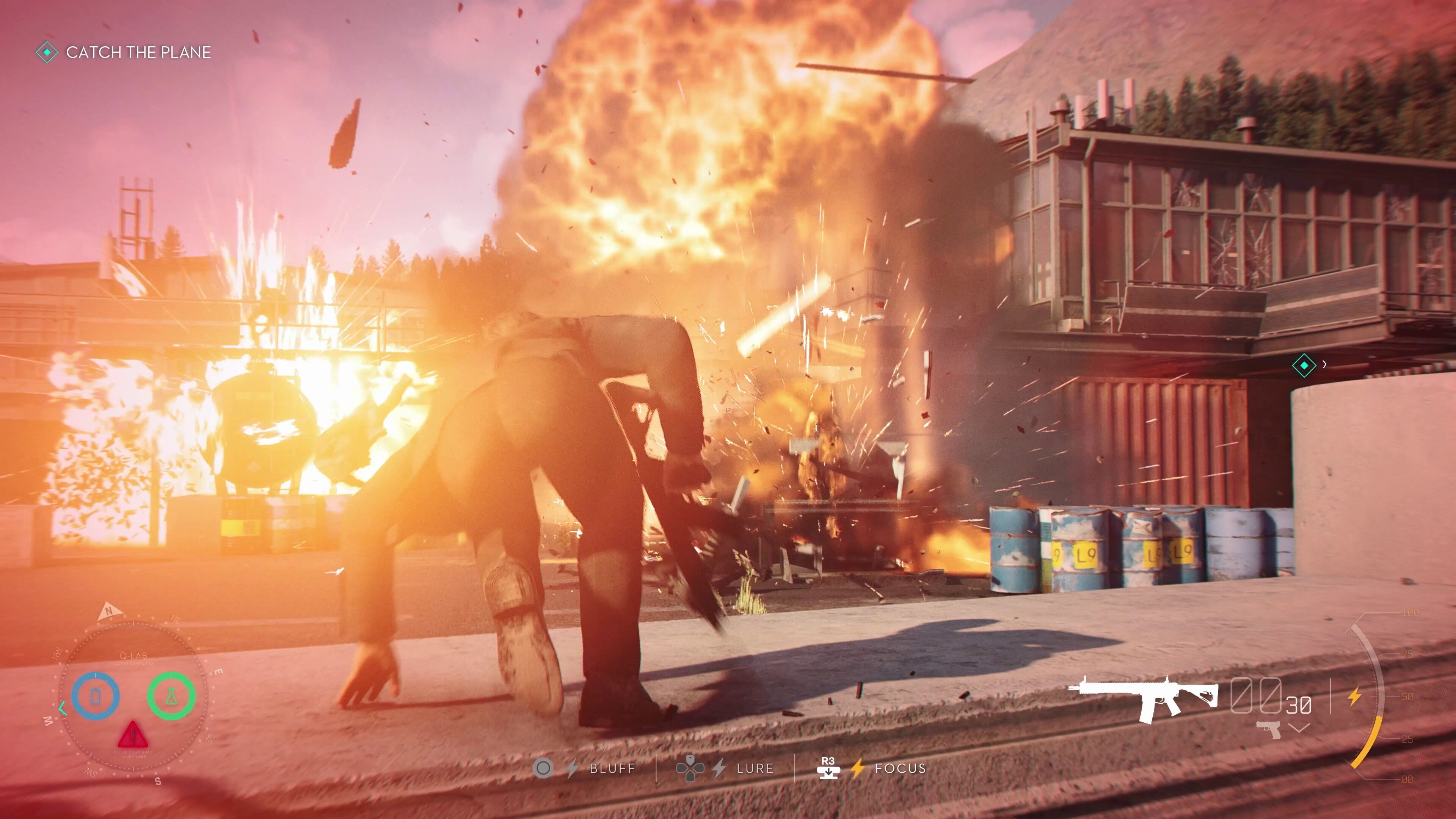 Explotan depósitos de combustible, se caen pasarelas mientras corremos por ellas y llegan enemigos en todoterrenos que nos cortan el paso. Mientras, Bond hace gala de agilidad y chulería. Lanza a los enemigos sus propias armas cuando se le gastan las balas. Mientras una plataforma se desmorona, corre para embestir a un adversario, cayendo al suelo sobre él. Recoge una escopeta del suelo dándole una patadita para empuñarla al vuelo. Es una secuencia de acción repleta de momentos scriptados, pero muy molona..