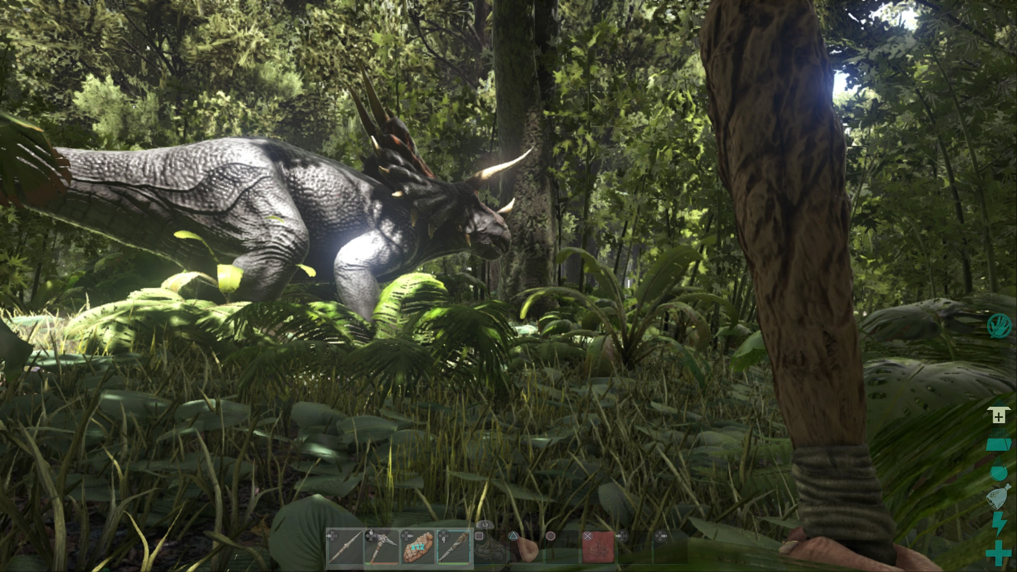 En este sentido, ARK ofrece un profundo menú de crafteo en el que podremos crear desde multitud de indumentarias, hasta objetos tan prácticos como una nevera que evita que se pudra la comida. Además, existe un completo menú de construcción para diseñar edificaciones complejas con múltiples materiales, así como una enorme variedad de armas de tipo melee (espadas, mazas…), fuego (pistolas, fusiles…), explosivas (granadas, C4…) o de alcance (arcos, ballestas…), por lo que será nuestra imaginación la que ponga límites a las posibilidades que ofrece el título.