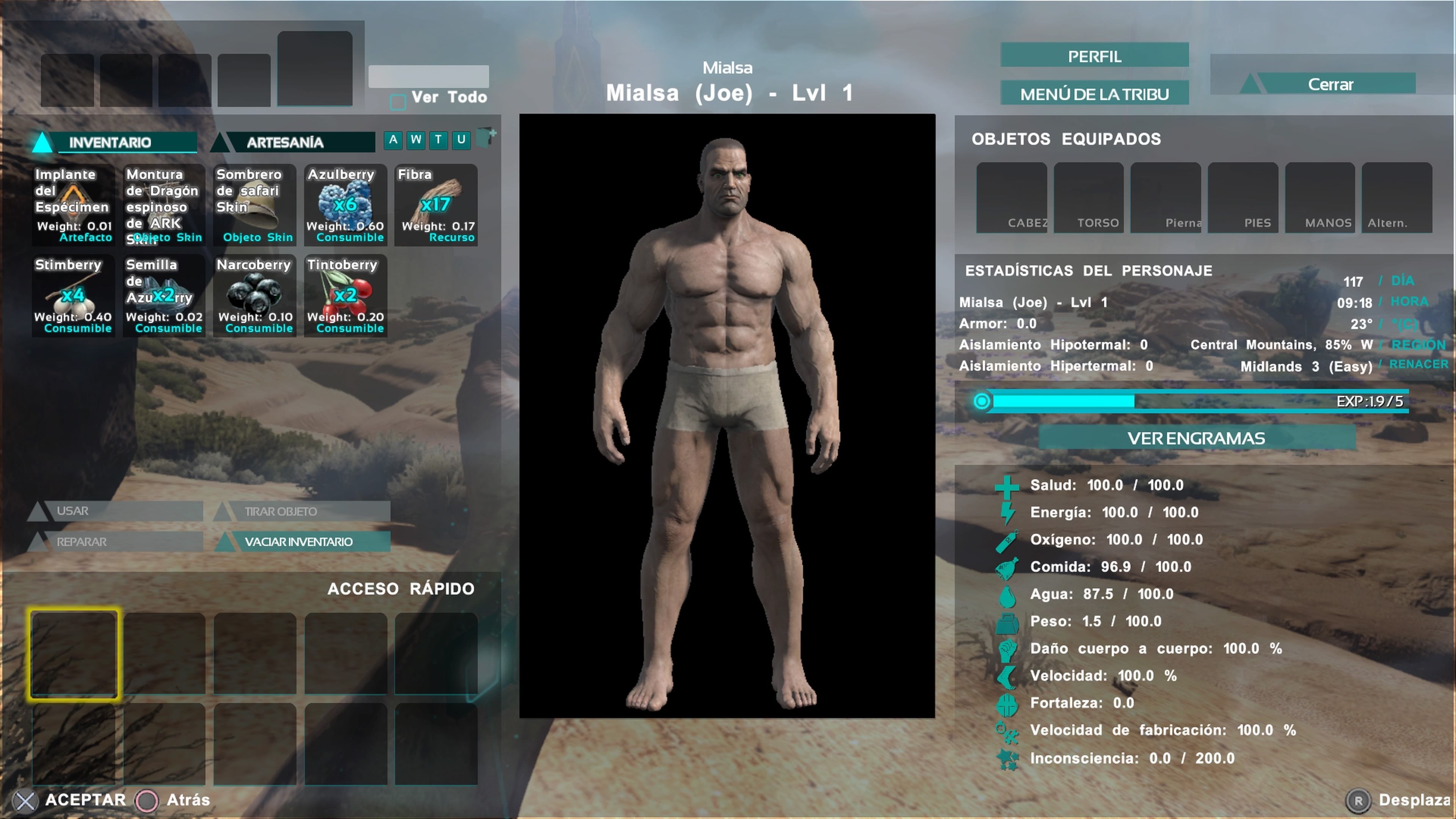 De esta forma, una vez configurada la apariencia física de nuestro avatar, comenzará la aventura. Lo primero que tendremos que hacer será recolectar materiales como madera, paja o piedra, que podremos almacenar en el inventario para posteriormente construir todo tipo de objetos y estructuras. Para ello, a medida que vayamos consiguiendo XP y subiendo de nivel, recibiremos EP (Enagram Points), que utilizaremos para desbloquear los objetos que más nos interesen. Una vez estén disponibles, y siempre que contemos con los materiales necesarios en el inventario, podremos crear lanzas, hachas, cantimploras o, por ejemplo, hogueras.