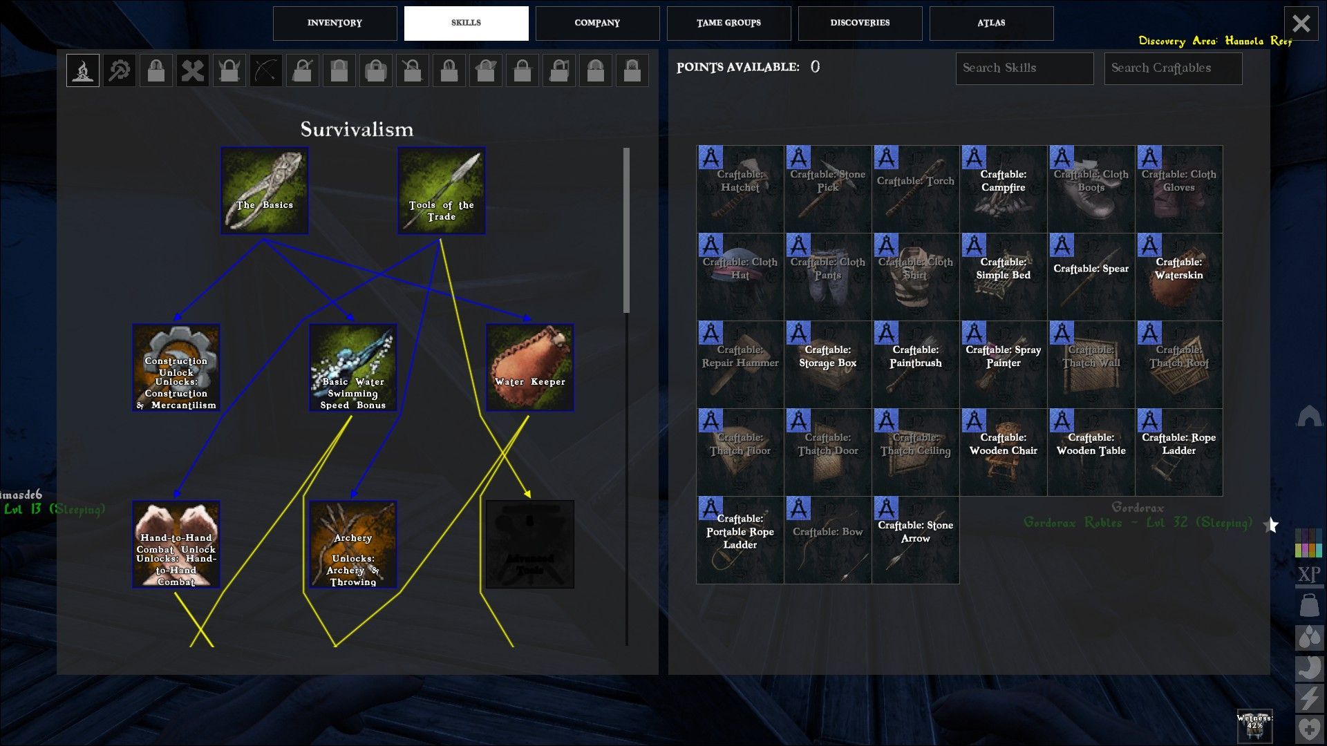 Dentro de esta profundidad podemos encontrar un árbol de progresión de habilidades más complejo que se divide en varias categorías y que nos permite tanto aprender a construir ciertas herramientas como mejorar nuestra pericia con cierto tipo de armas e incluso mejorar nuestra capacidad para nadar, entre otras muchas habilidades.