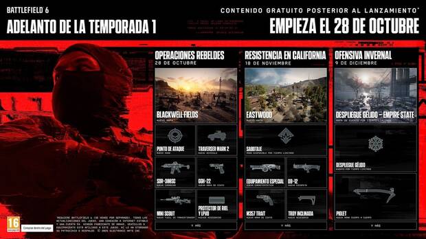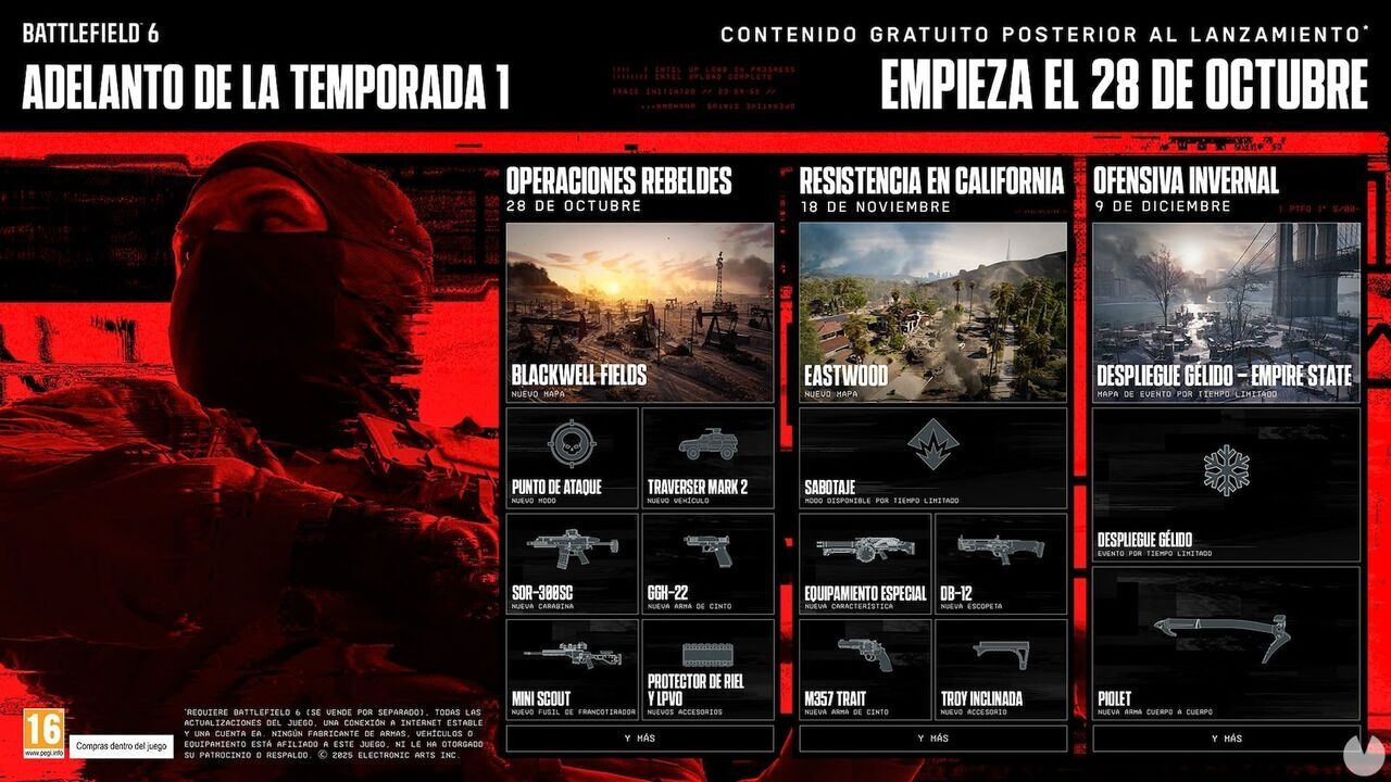 Antes de contaros nuestra experiencia con los nuevos mapas, armas y modos, vamos a empezar explicando cómo funcionará la llegada de nuevo contenido a Battlefield 6 y el sistema de temporadas (ya común en la industria) que también han adoptado en esta entrega.