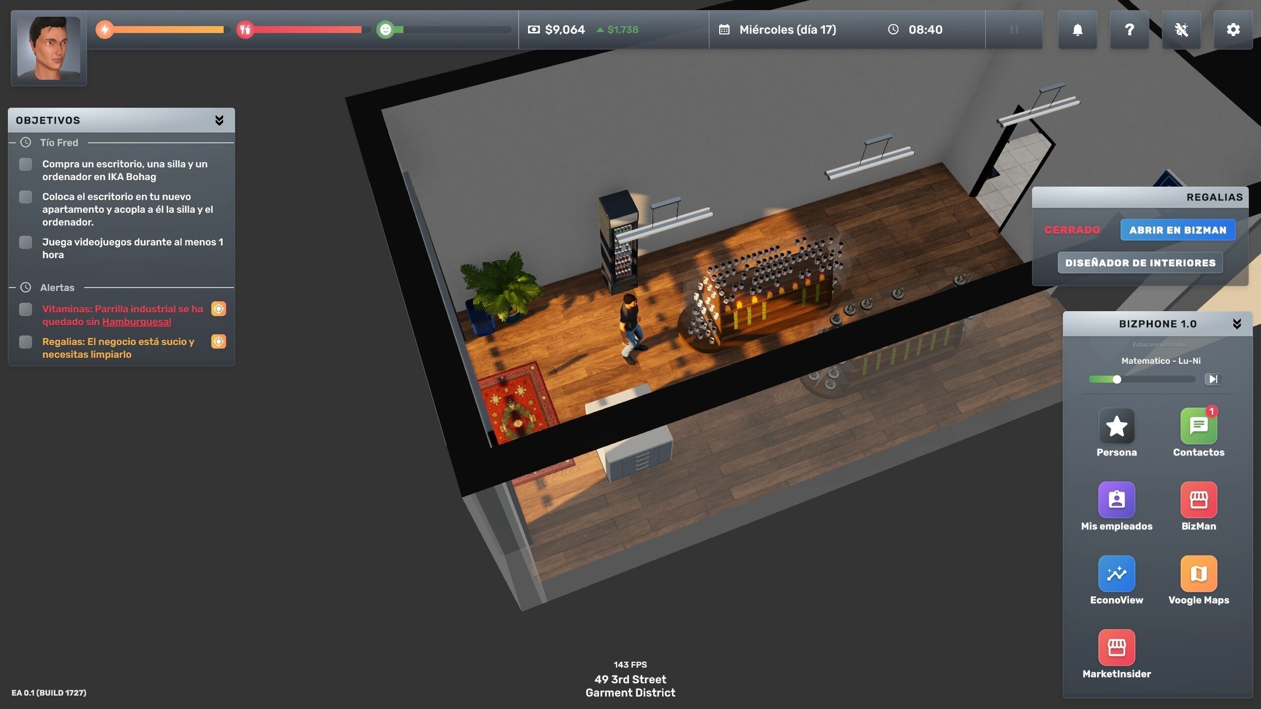 A partir de este momento es en el que ya podemos disfrutar de la libertad total que nos ofrece Big Ambitions, permitiéndonos gestionar estos dos negocios "impuestos" tal y como queramos para alcanzar ese objetivo, teniendo que escoger si invertimos en más productos para nuestras tiendas para ampliar la oferta y atraer a más clientes, decorarla con mucho gusto para que los compradores se encuentren cómodos en nuestro local, gestionar con inteligencia las horas de trabajo de nuestros empleados u optar por distintas políticas de precios para ser más competitivos.