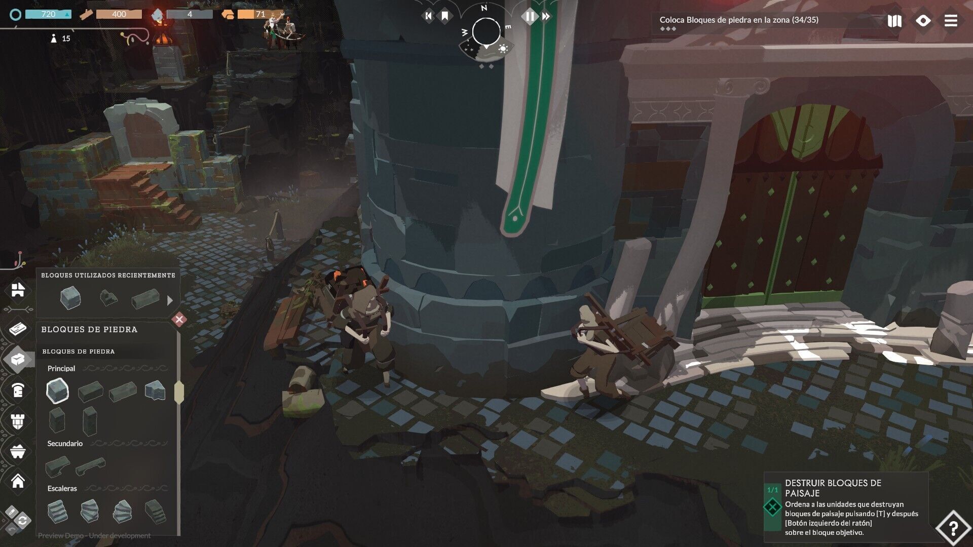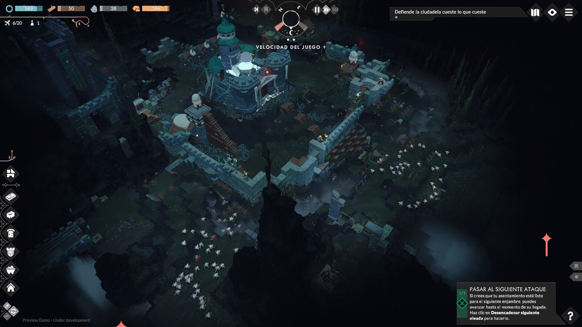 La recolección de recursos también es parte de la construcción, aunque está ajustada para no resultar pesada, al menos en la demo, ya que no es parte del núcleo del juego, pero sigue presente de manera automatizada al estilo Age of Empires. Esto añade interés al juego al tener que considerar qué materiales utilizar y cuándo es mejor aprovecharlos o guardarlos para el futuro.