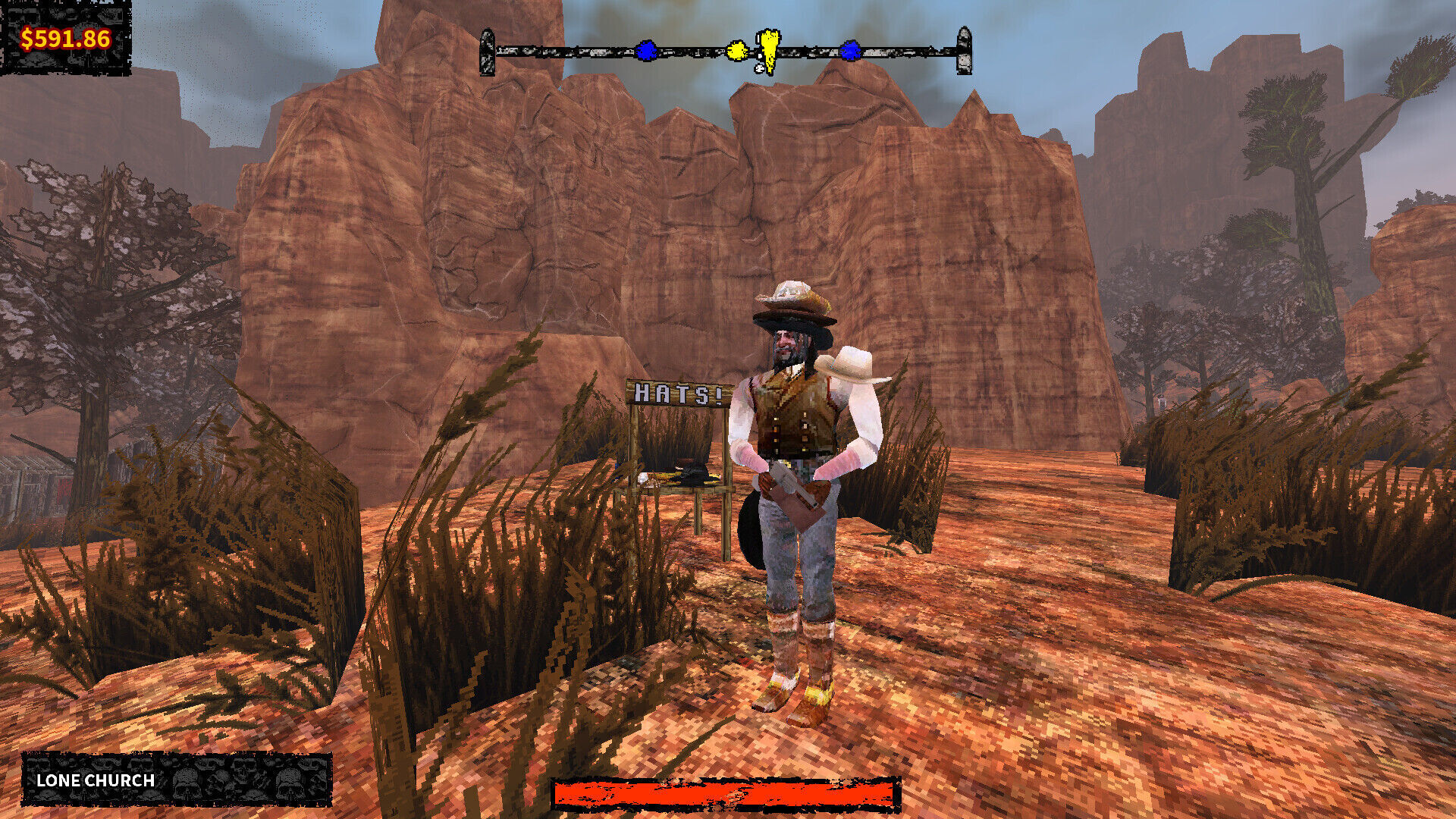 Puedes devolver balas con los dedos pulsando un botón, e incluso tienes una acción para dar una voltereta y así esquivar el fuego enemigo. Dentro de tu arsenal, dispones de revólveres, rifles y recortadas. Su diseño puede resultar simple, pero cuando juegas lo suficiente te das cuenta de que cada arma dispone de sus propias estadísticas, incluyendo precisión y durabilidad. Tu equipamiento, que mejora tu resistencia a los impactos, también puede deteriorarse, y tienes la opción de acudir a un "mecánico" a que te ayude a repararlo a cambio de dinero. Y si no, puedes deshacerte de lo que no te sirva, porque cada ítem pesa y tiene un impacto en la velocidad a que te desplazas.