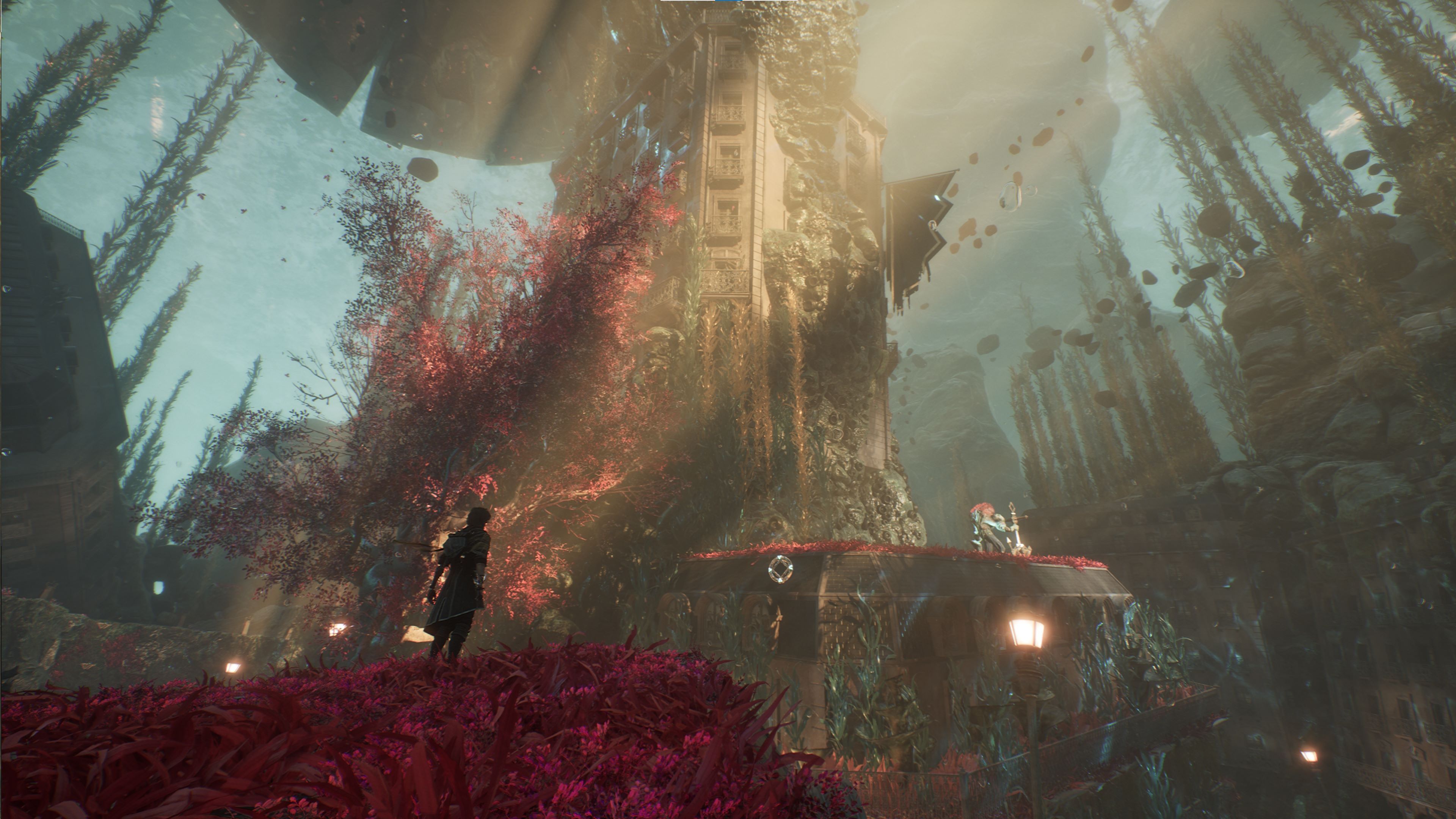 El mundo no solo es atractivo en lo narrativo, sino también en lo visual y en estructura. No es un mundo abierto, sino que exploramos a pie (seleccionando el personaje que queramos, algo que no tiene efectos en la partida), a veces ayudándonos de un gancho, escenarios lineales con algunos caminos alternativos que nos permitirán descubrir equipamiento e incluso jefes opcionales. Hay una misteriosa mansión que parece funcionar como base de operaciones desde la que trasladarnos a diferentes mundos.