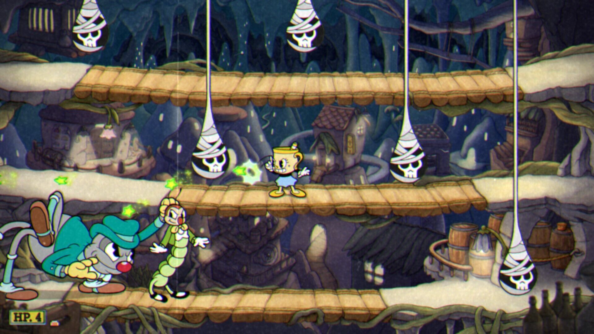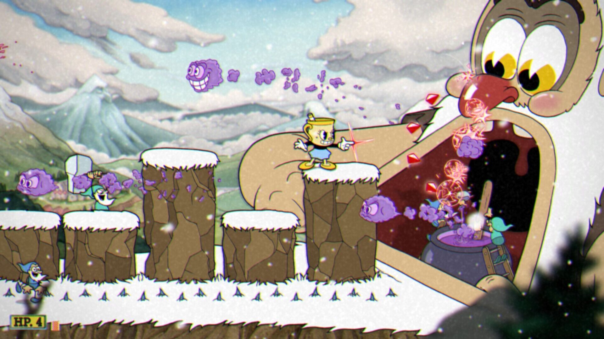Otra de las grandes novedades de esta expansión la tenemos en la inclusión de la Señorita Cáliz como personaje jugable, quien tiene algunas diferencias fundamentales respecto a Cuphead y Mugman. Pues cuenta con un punto de vida adicional, puede realizar un salto doble, tiene la habilidad de rodar por el suelo para evitar daños y las paradas las realiza con el movimiento de esquiva, algo a lo que deberemos acostumbrarnos, pues cambia por completo la forma en la que ejecutamos esta maniobra. En líneas generales, es un personaje muy poderoso y versátil que nos irá de lujo contra muchos jefes, aunque aquí tenemos que destacar que no puede equiparse con ningún amuleto, ya que para controlarla será necesario que coloquemos una galleta especial en dicha ranura.