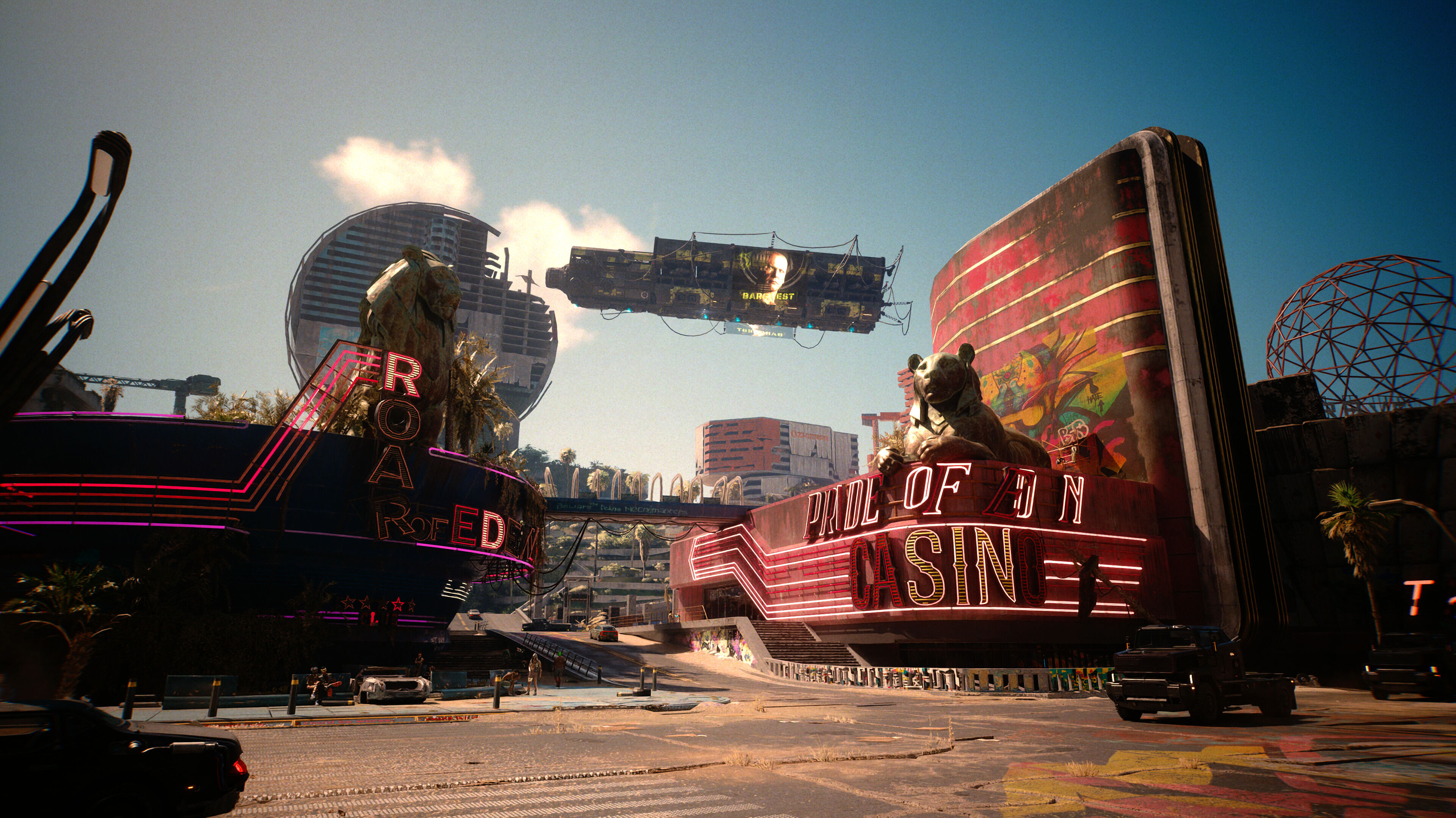 Tenemos que aplaudirle a CD Projekt por ir a por lo difícil en lo que respecta al diseño de niveles. En una época en la que la inmensa mayoría de juegos de mundo abierto apuestan por huir de las ciudades en favor de pequeños poblados y mucho, mucho campo que se pueda generar procedimentalmente y se optimice fácil, aquí nos encontramos con escenarios pensados al milímetro, increíblemente densos, y con detalles por todas partes. Night City nos parece una de las mejores ciudades creadas en un videojuego, y Dogtown no es una excepción.