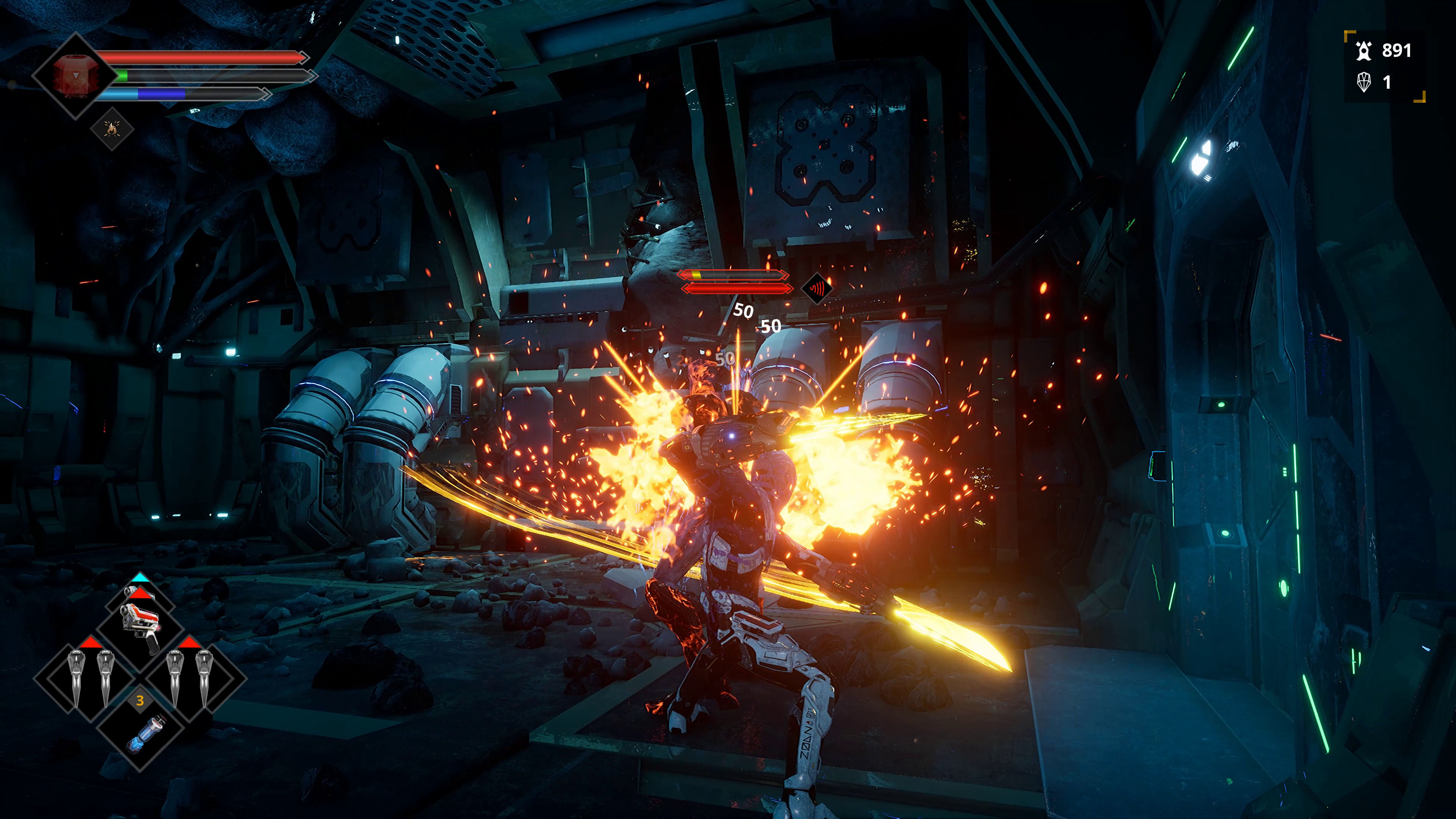 La resistencia, como viene siendo habitual, determina nuestra capacidad para encadenar varios golpes mientras combatimos cuerpo a cuerpo y también el tiempo que podemos correr en una zona sin agotarnos mientras que por otro lado tenemos la energía del traje, una especie de maná que servirá para que disparemos las armas a distancia, para que utilicemos un poder especial que imbuirá las armas cuerpo a cuerpo de diferentes elementos o para curarnos parte de nuestras heridas a costa de perder la mitad de la energía de nuestro traje.