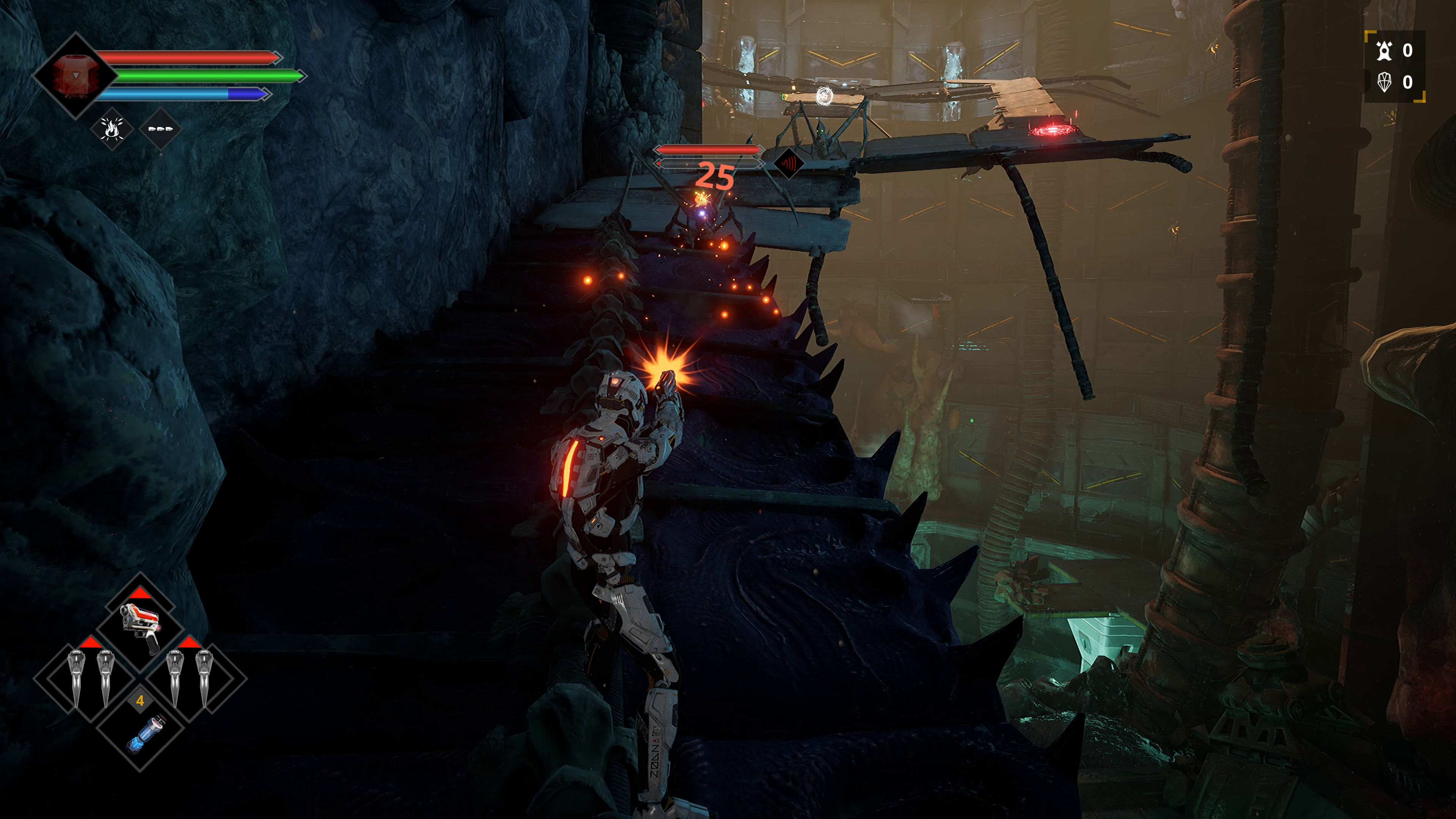 Dentro del combate hay algo que nos parece muy interesante y que precisamente por eso tiene su sección aparte que es la resistencia de nuestro personaje y de la energía de nuestro traje, dos puntos que deberemos gestionar bien si queremos sobrevivir y no acabar siendo pasto de los alienígenas que quieren acabar con nuestra vida.