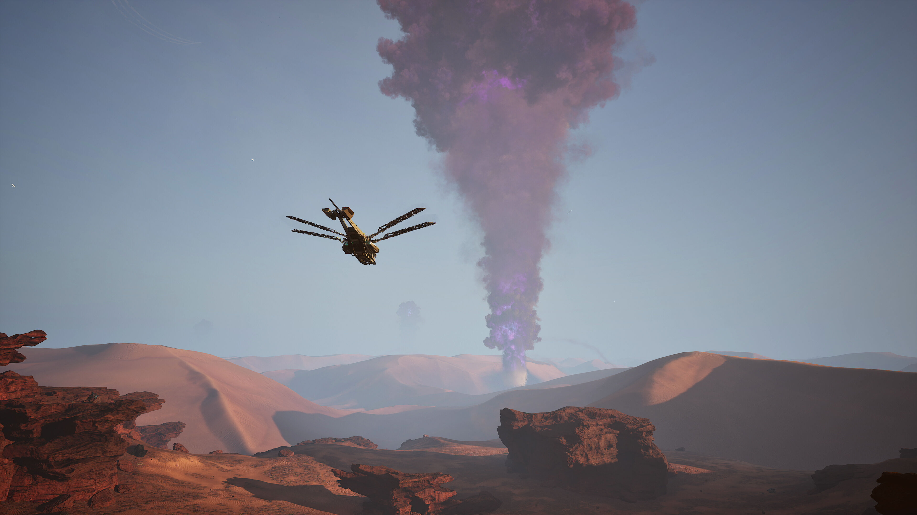 Es complicado recrear un planeta desértico enorme para que sea un lugar atractivo en el que queramos pasar decenas y cientos de horas. La variedad, siempre dentro de los límites de esta ambientación, se logra a través de construcciones rocosas que sirven como punto de interés, mediante un diseño del escenario vertical que sorprende porque esconde bajo nuestros pies mucho más de lo que se pudiera pensar, y al centrar la mayor parte del desplazamiento por el escenario en los vehículos. Hay máquinas aéreas como los tópteros (las icónicas libélulas) y otras pensadas para moverse sobre la arena. Podemos fabricar y modificar nuestros vehículos, pero también encontraremos otros por el escenario que nos serán de ayuda. Además, como en The Legend of Zelda: Breath of the Wild, se podrá escalar absolutamente todo siempre y cuando tengamos la resistencia suficiente, y también dispondremos de un gancho.