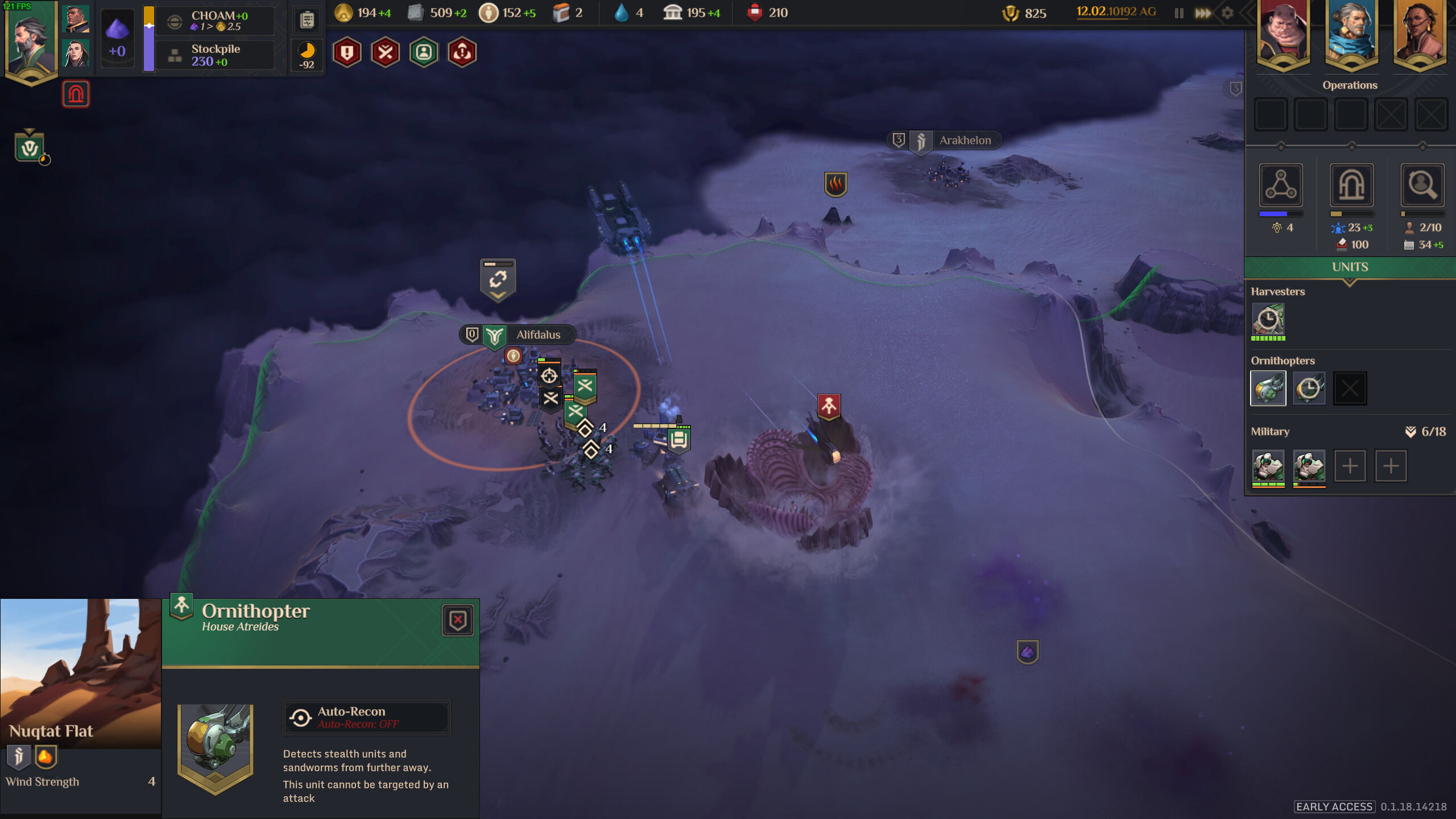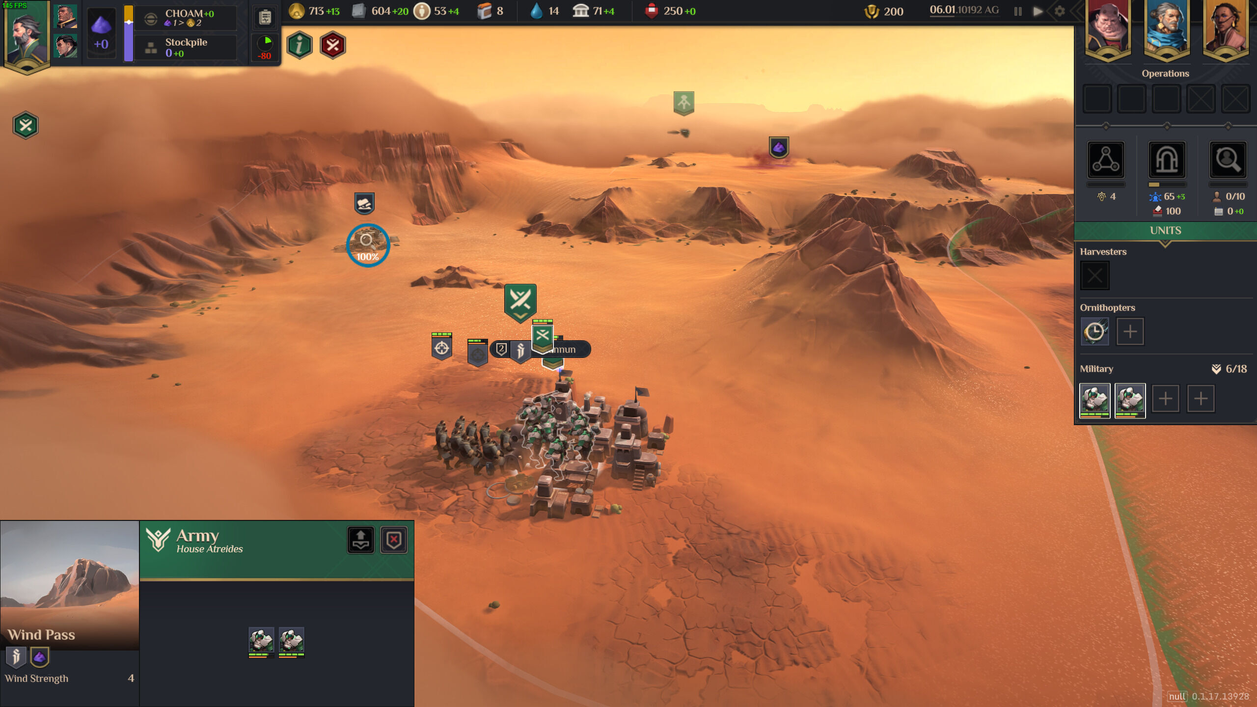 Otro punto clave durante los primeros compases de nuestra partida ha sido el crear nuestras primeras unidades de combate para nuestra defensa y, sobre todo, para asaltar y conquistar poblaciones cercana a "campos" de especias, necesarias para que podamos desplegar nuestros recolectores y obtener este preciado recurso. Precisamente ahora que hablamos de conquistas, el combate es bastante sencillo y nuestra intervención es mínima, simplemente mandando nuestras tropas al combate para enfrentarse de forma automática con el enemigo, ganando habitualmente el que tenga más unidades, siendo uno de los puntos que creemos que necesita más trabajo dentro de este acceso anticipado.