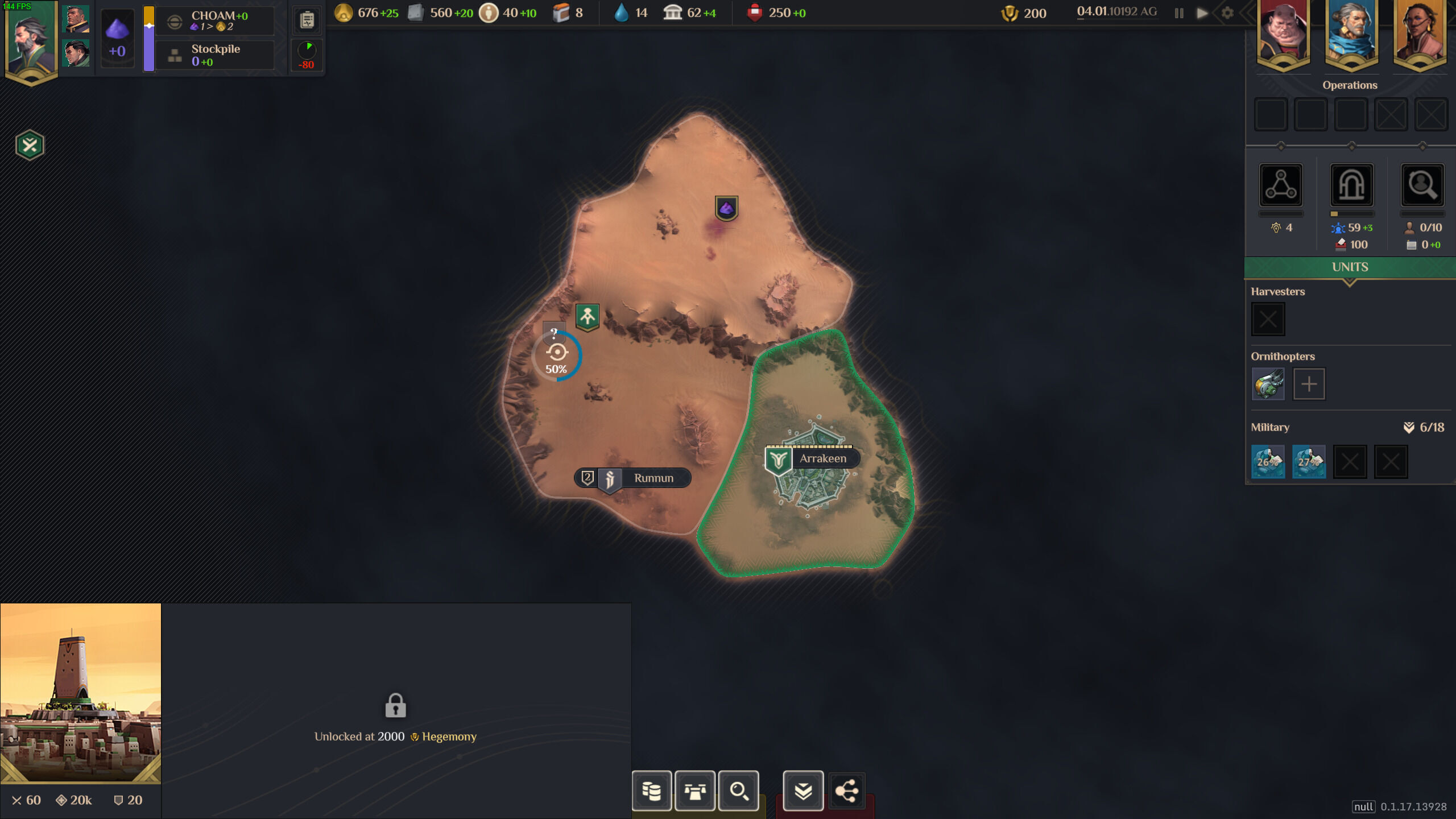 Por lo demás, al menos durante estas primeras partidas estamos ante un juego de estrategia 4X más con diferentes variables como construcciones, tecnologías y un largo etcétera de características y cuestiones que deberemos gestionar para intentar hacernos con la victoria de tres formas: Dominación (destruyendo el resto de facciones), Gobierno (eligiéndonos como el "presidente" de Arrakis en un concilio especial) o Hegemonía (se produce al llegar a 50.000 puntos de hegemonía que se ganan a lo largo de la partida avanzando tecnológicamente, recolectando especia, conquistando territorios... etc.)