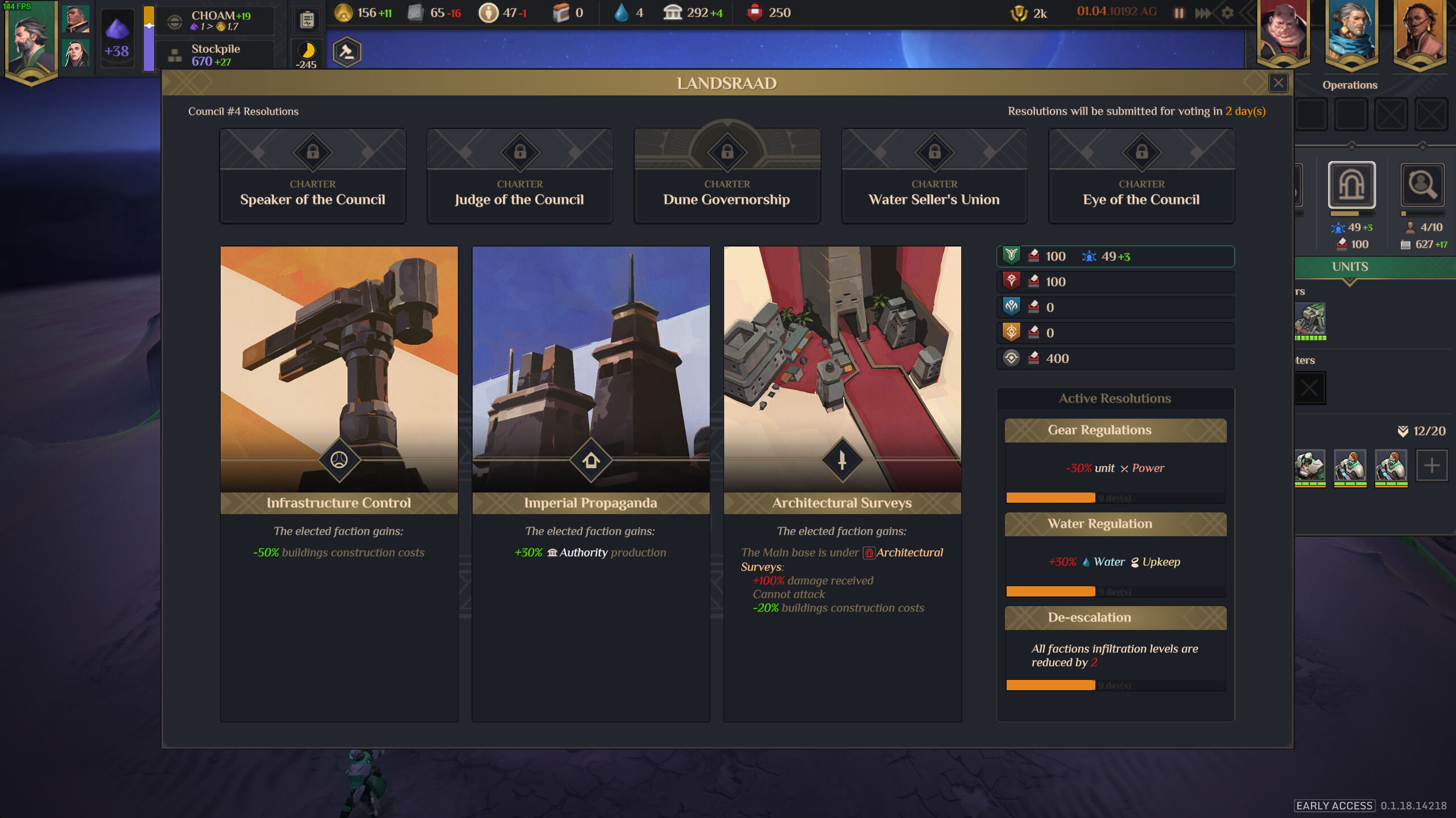 Todo esto se adereza con las clásicas relaciones diplomáticas o de comercio y, lo que es más interesante, el Concilio de Landsraad, unas votaciones que tienen lugar cada cierto tiempo y que nos permiten votar entre tres resoluciones diferentes que cambian temporalmente las "reglas" de juego teniendo impacto durante los 20 próximos días, alterando por ejemplo los beneficios que da el vender agua o la casa que se encargará de ejecutar ciertas tareas durante la partida.