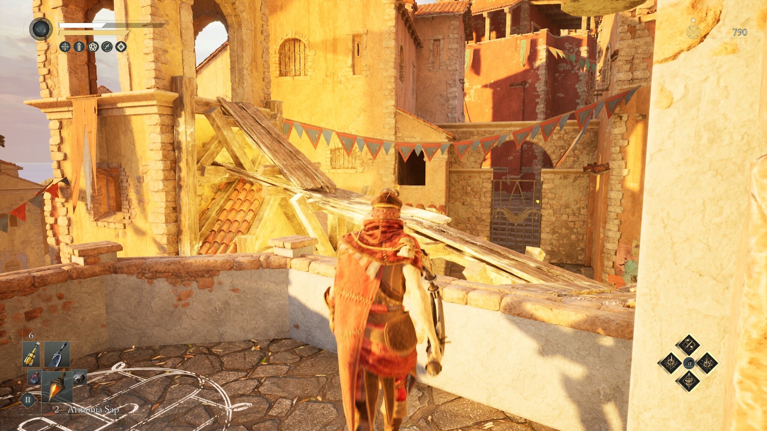 Porque aquí tampoco faltan los enemigos escondidos, los arqueros que fastidian desde la lejanía cuando combatimos a un adversario, los grupos de enemigos a los que tratar de dividir, los caminos alternativos con cofres, combates y otros recursos, y también los momentos de plataformeo por tejados, puentes y espacios estrechos sobre precipicios que conducen a la muerte. Hay una particularidad de Enotria que tiene potencial pero a la que de momento se le saca mucho partido: hay puntos muy concretos en los que podemos modificar la realidad para crear caminos, a veces necesarios para avanzar y otras para encontrar tesoros o acercarnos a los enemigos con ventaja.