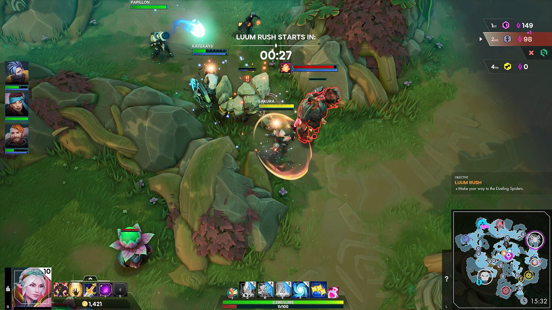 También hay minijefes y patrullas que nos pueden pillar desprevenidos en medio de una de esas actividades, momento en el que la situación se vuelve caótica. Así, todas las partidas que hemos jugado han sido distintas. E intensa. La cuestión es que mientras hacemos todo esto vamos obteniendo, además de experiencia con la que subir de nivel y aprender habilidades (tres normales y una definitiva: de nuevo, como en LoL) y oro con el que comprar objetos en las tiendas repartidas por el mapa, un recurso por el que competimos con el resto de equipos: el ranking siempre está, ilusionante o amenazante, en la parte derecha de la pantalla. Y es importantísimo. Primero, porque la segunda fase de la partida nos pone a resistir oleadas de enemigos que atacan nuestra fuente de ese recurso, y el equipo que se quede a cero (o con menos) queda eliminado (después puede seguir viendo la partida o buscar otra). Segundo, porque antes de la fase final, precedida por otra fase de jungleo, el equipo que menos puntos de este recurso tenga también se elimina.