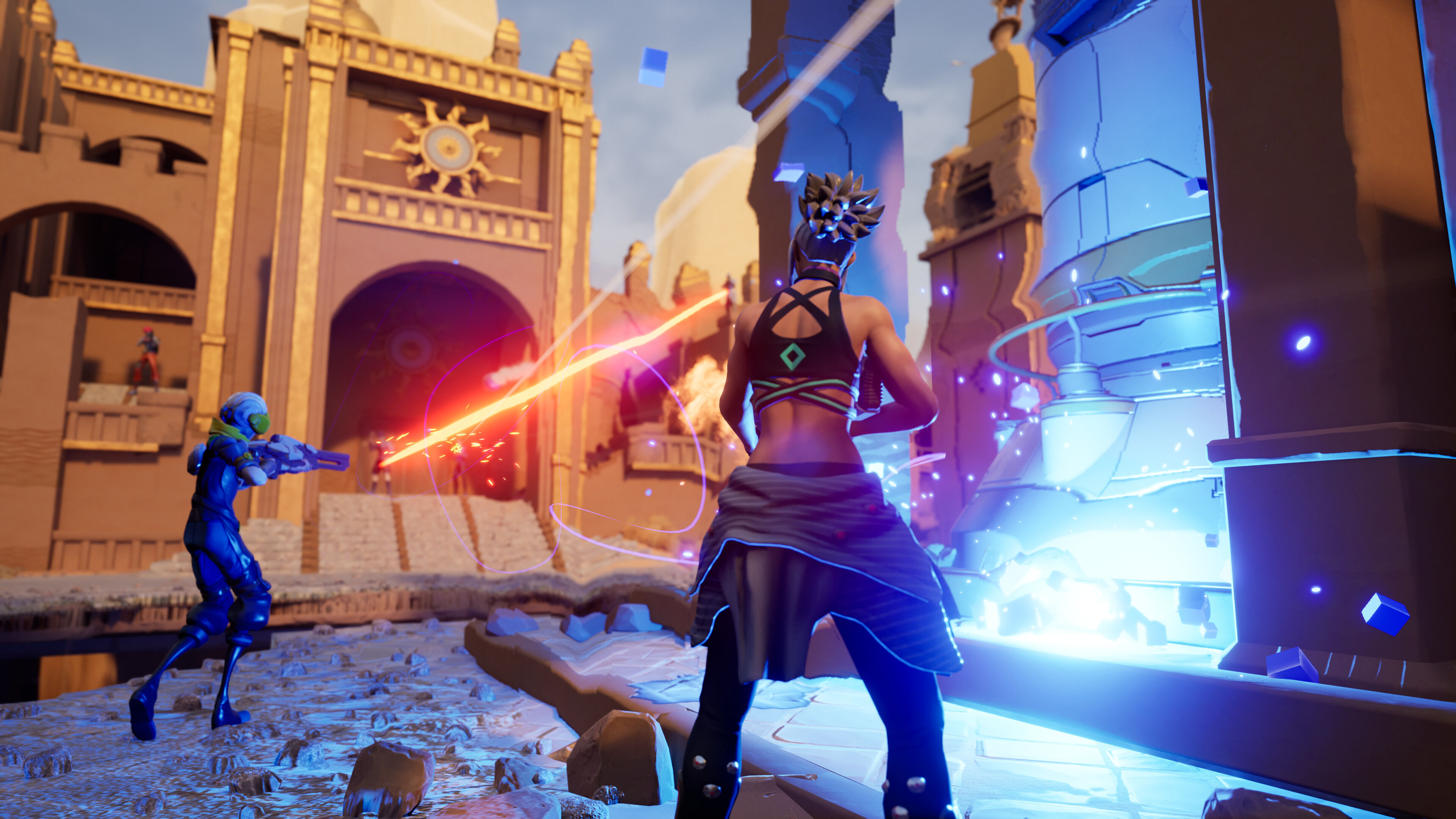 No parece que vaya a ofrecer un gameplay muy profundo en lo que a mecánicas de disparo se refiere, pero lo que nos mostraron tiene pinta de ser, al menos, satisfactorio. Es totalmente arcade, y de hecho no existe ni siquiera el concepto de la munición, pero tiene ese toque frenético, preciso y accesible de los arena shooter de finales de los primeros 2000, pero en tercera persona. Dentro del distrito de combate también hay una tienda de armas (no se utiliza dinero real) que, en principio, se podrán utilizar en todos los modos.