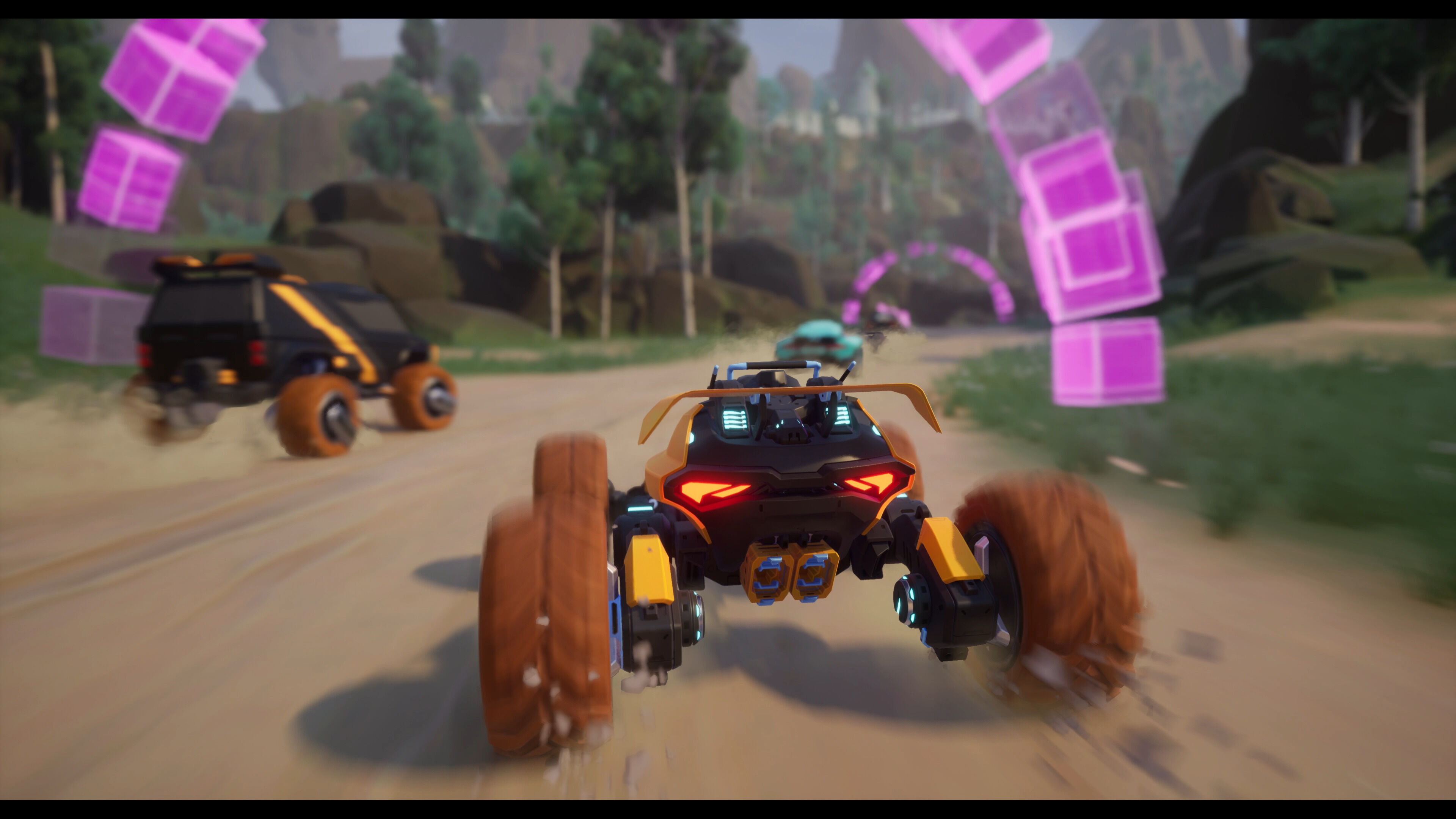 Build a Rocket Robot aseguran que su título es una experiencia "dirigida por el gameplay y centrada en el gameplay", lo que conlleva que lo principal es que cada acción sea satisfactoria a los mandos. Eso se aplica en la parte de shooter, en el simple hecho de mover el personaje, y también en las actividades del Distrito de conducción. Allí encontraremos carreras y otros modos centrados en los vehículos, con un control muy arcade y con la premisa de ser "fácil de aprender y difícil de dominar". También en este espacio hay una tienda, donde vemos expuestos coches y piezas de personalización, principalmente cosméticas, aunque también podemos toquetear levemente los ajustes de conducción de nuestros vehículos.