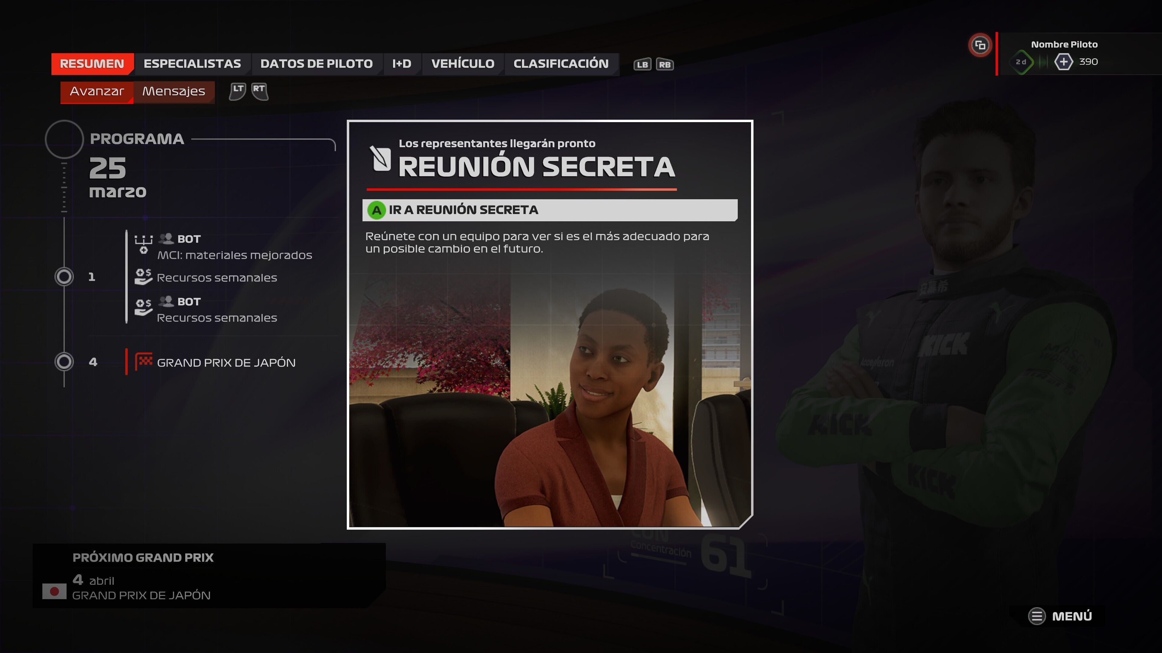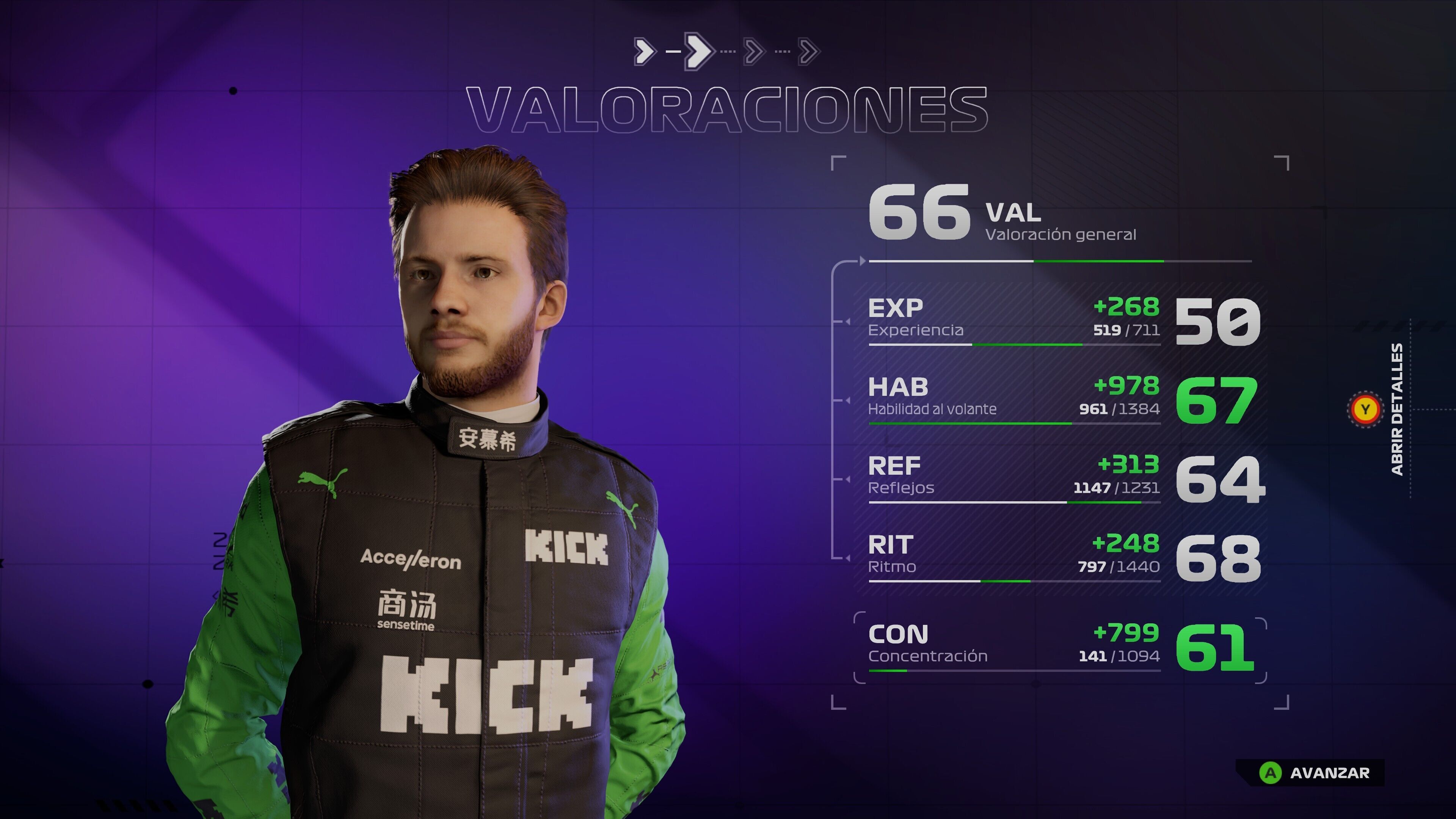 Pero, más allá de eso, también hay unos cuantos ajustes evidentes en el modo Carrera. En este caso, nosotros hemos comenzado una temporada del modo Carrera para Piloto, creando nuestro propio alter ego virtual (aunque se nos permite tomar el control de cualquier piloto real) que cuenta con sus propias estadísticas de experiencia, ritmo, etc.