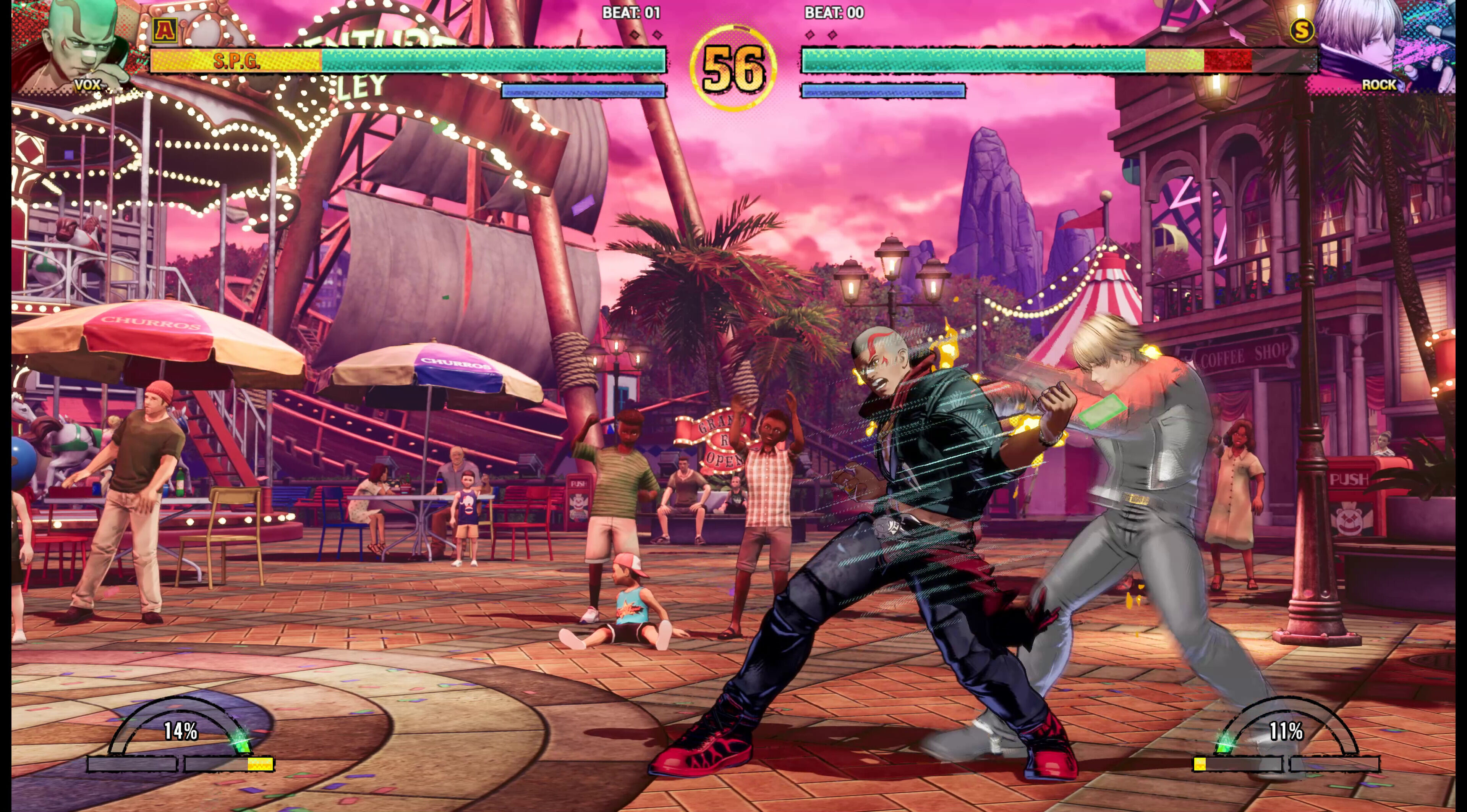 A pesar de ser una versión a la que aún le quedan muchos meses de desarrollo, lo que vimos en pantalla nos resultó muy atractivo, siempre teniendo en cuenta que es un juego intergeneracional. No tiene el lustre, la espectacularidad, de un Street Fighter 6, pero los movimientos son vistosos, el diseño de los personajes está muy cuidado, y los dos escenarios en los que jugamos (un parque de atracciones y un barrio nocturno) están repletos de detalles y objetos en movimiento. Sí se nota que SNK tiene trabajo por delante en los tiempos de carga, que hoy día en el género son una reliquia del pasado, y en ciertos movimientos extraños de la cámara.