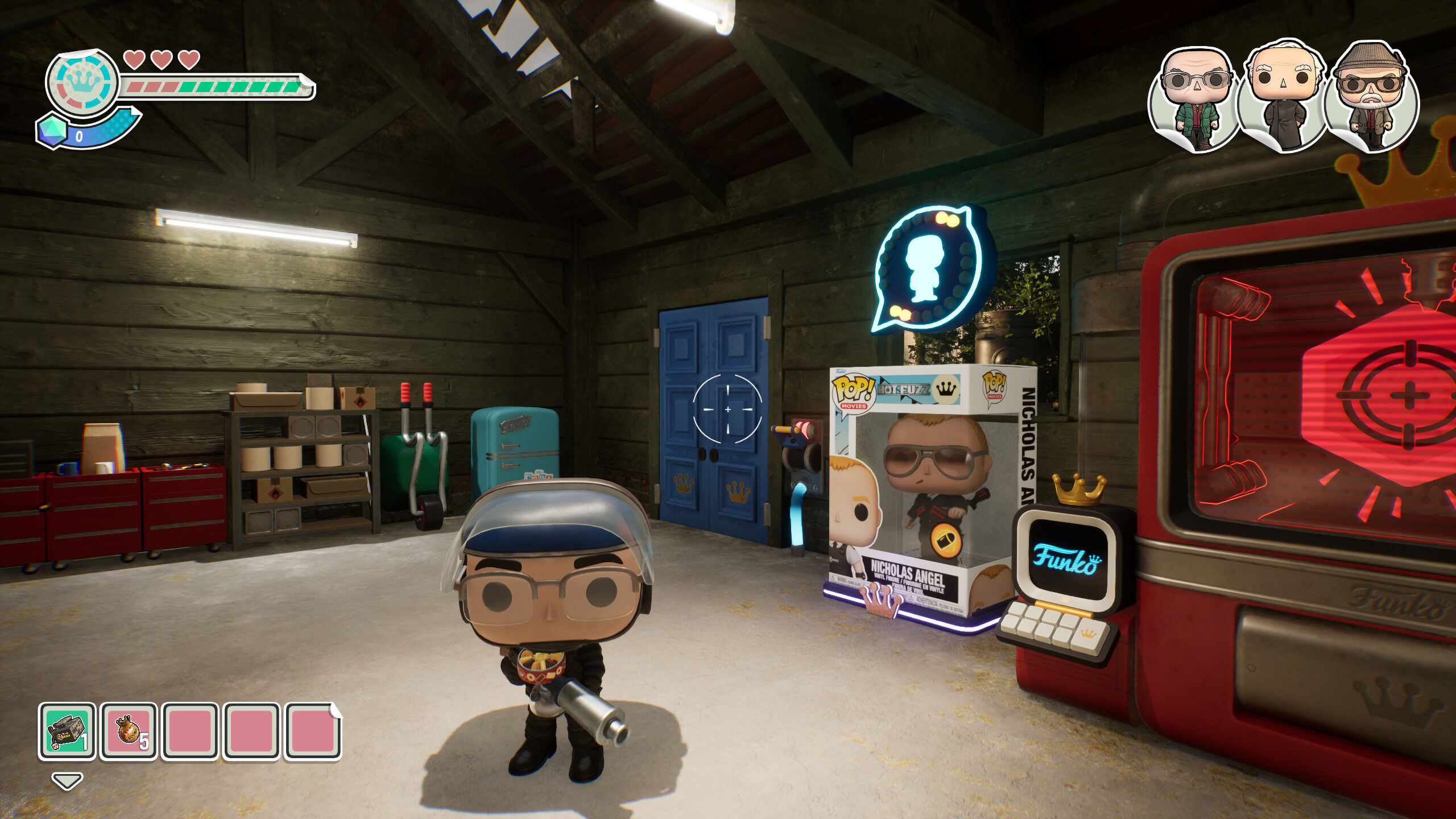 Como shooter es sencillo pero funcional, con una esquiva que utilizaremos cuando nos rodeen (algo que pasa mucho, pues los enemigos son abundantes y agresivos) y con disparos a la cabeza satisfactorios, pues hacen que las cocorotas de los adversarios salgan con un gracioso pop. Destaca, eso sí, en la variedad de armas que conseguimos al abrir cofres que encontramos en los escenarios. Podemos cambiar de personaje en distintos puntos de los mundos, y cada cual tiene un arma principal con munición infinita y otra cuerpo a cuerpo (por ejemplo, Nicholas Angel golpea con un cono). Eso sí, salvo por los que sacan un escudo en lugar de esquivar, el estilo de juego no cambia apenas entre uno y otro, pro podemos equiparles utensilios con munición limitada muy variados, desde clásicos como granadas y lanzallamas a otros algo más complejas de usar, pero más efectivos y graciosos.