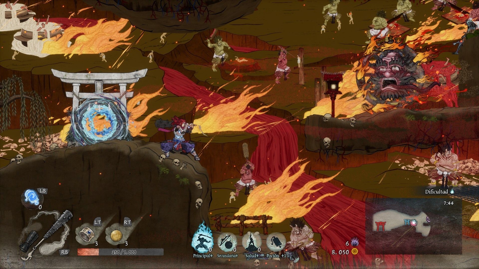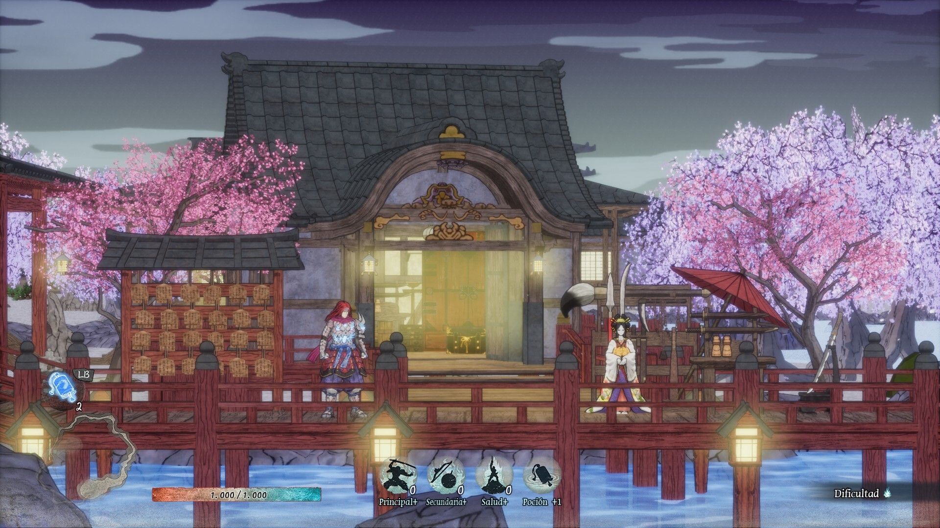 Donde sí que no vamos a poner pegas es en su apartado audiovisual, ya que en lo artístico es un juego precioso y con muchísima personalidad que parece una pintura japonesa en movimiento. Además, el diseño de enemigos está bastante bien (mucho ojo a los jefes) y las animaciones son fluidas y naturales, permitiéndonos leer perfectamente a nuestros rivales para que sepamos en todo momento qué es lo que van a hacer. La banda sonora también nos deja con temas muy nipones y de calidad que acompañan a la perfección todo lo que vemos en pantalla, mientras que los efectos se limitan a cumplir su función sin grandes alardes.