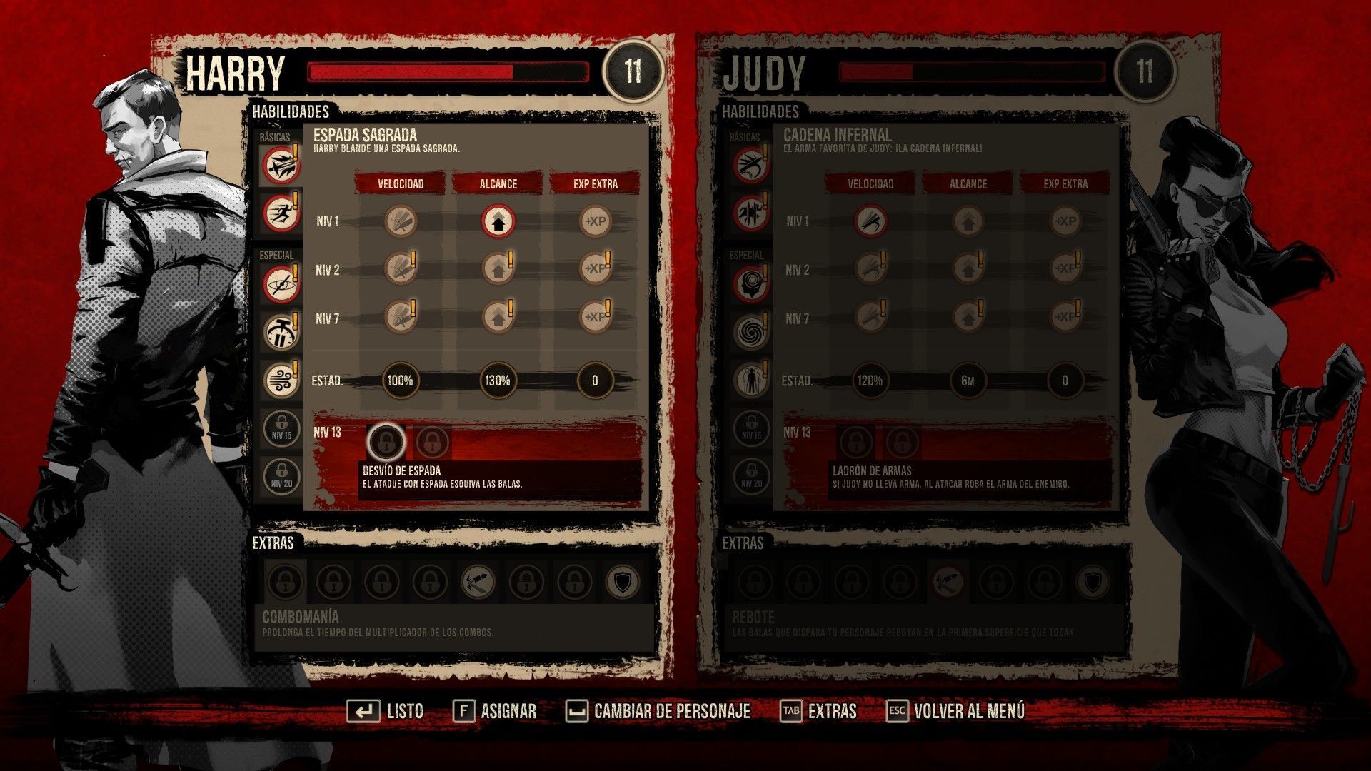 Además tenemos un sistema de niveles con personalización de cada protagonista que permite editar aspectos básicos antes de la batalla: sus habilidades básicas, las especiales y una serie de extras comunes a ambos. ¿Quieres ataques de espada para Harry más rápidos, que tengan un mayor alcance o proporcionen más experiencia? ¿Quieres reducir el coste de la ralentización del tiempo o aumentar su efecto? Con Judy podemos potenciar su vórtice oscuro, la creación de un clon que despista a los enemigos y más. En las habilidades extra quizás desees que puedan aguantar un disparo de bala, que las explosiones no causen daño, que los disparos atraviesen a varios enemigos o un multiplicador de combos. En cualquier momento puedes retirar los puntos de estas ventajas para redefinir la evolución del personaje.