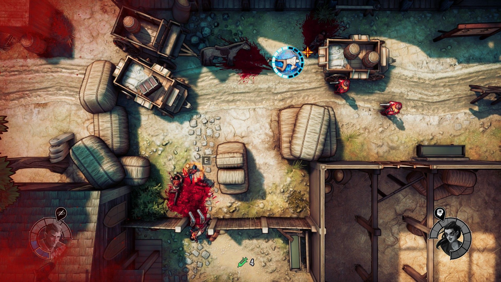 La segunda particularidad del juego, y no siempre presente en estos títulos, es la opción de jugar en cooperativo. En modo un jugador alternas en cualquier momento entre los personajes, ya sea porque nos guste más su estilo de juego de uno o por las habilidades para superar obstáculos. Pero si quieres disfrutar más de lo que ofrece God's Trigger, tenemos un modo cooperativo en el que dos jugadores progresan por el mapa con cada héroe, y además se añade otra mecánica más: la opción de resucitar al compañero caído. Si uno de los jugadores muere, quedará agonizando durante unos instantes en los que el amigo puede resucitar al personaje; el proceso lleva apenas unos segundos, pero el combate es tan rápido que necesitarás despejar la pantalla primero para hacerlo con comodidad.
