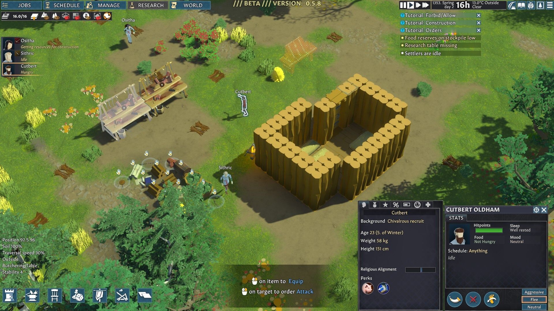 El equipo también está preparando más eventos relacionados con los animales, que por el momento se limitan a ataques de lobos, manadas que pueden acabar con la fuente de alimentación de nuestro grupo. Por último, entre los cambios más recientes está la posibilidad de plantar árboles y sin ningún coste, aunque necesitarás mucho tiempo para ver los resultados y se aconseja tener clara su colocación desde un principio: tu base seguramente se expandirá con el tiempo y podrías tener problemas con tu arboleda. Por otra parte, se amplió el número de recursos con el carbón, útil para sustituir la madera como combustible; además, se puede utilizar para trabajar el hierro.