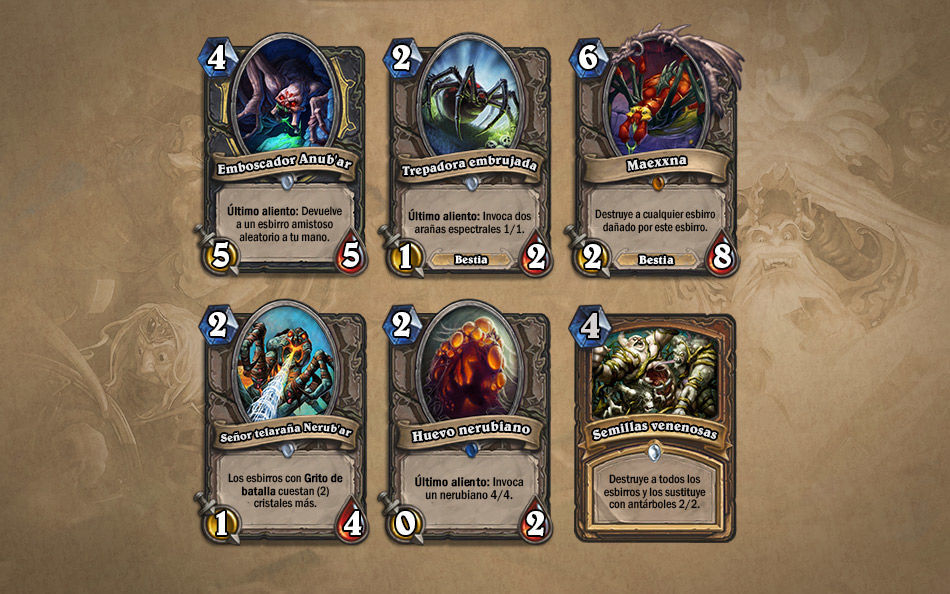 Así pues, ahora mismo solo podemos acceder al Arrabal Arácnido (cuya entrada será gratuita durante su primer mes), donde nos esperan tres jefes a derrotar: Anub'Rekhan, Gran Viuda Faerlina, y Maexxna. Cada uno de ellos cuenta con habilidades y cartas únicas que nos obligarán a cambiar el chip de nuestras estrategias habituales para poderlos derrotar. Si bien en su modo normal no suponen un desafío demasiado complicado, hasta el punto de que podemos derrotarlos con mazos básicos mínimamente personalizados, todo cambia en su modo heroico, el cual desbloquearemos al completar el ala por primera vez.