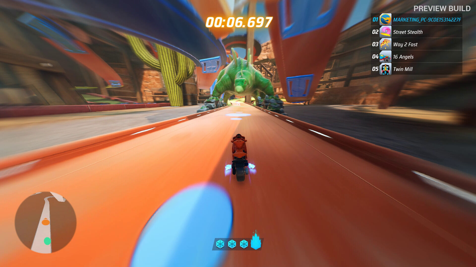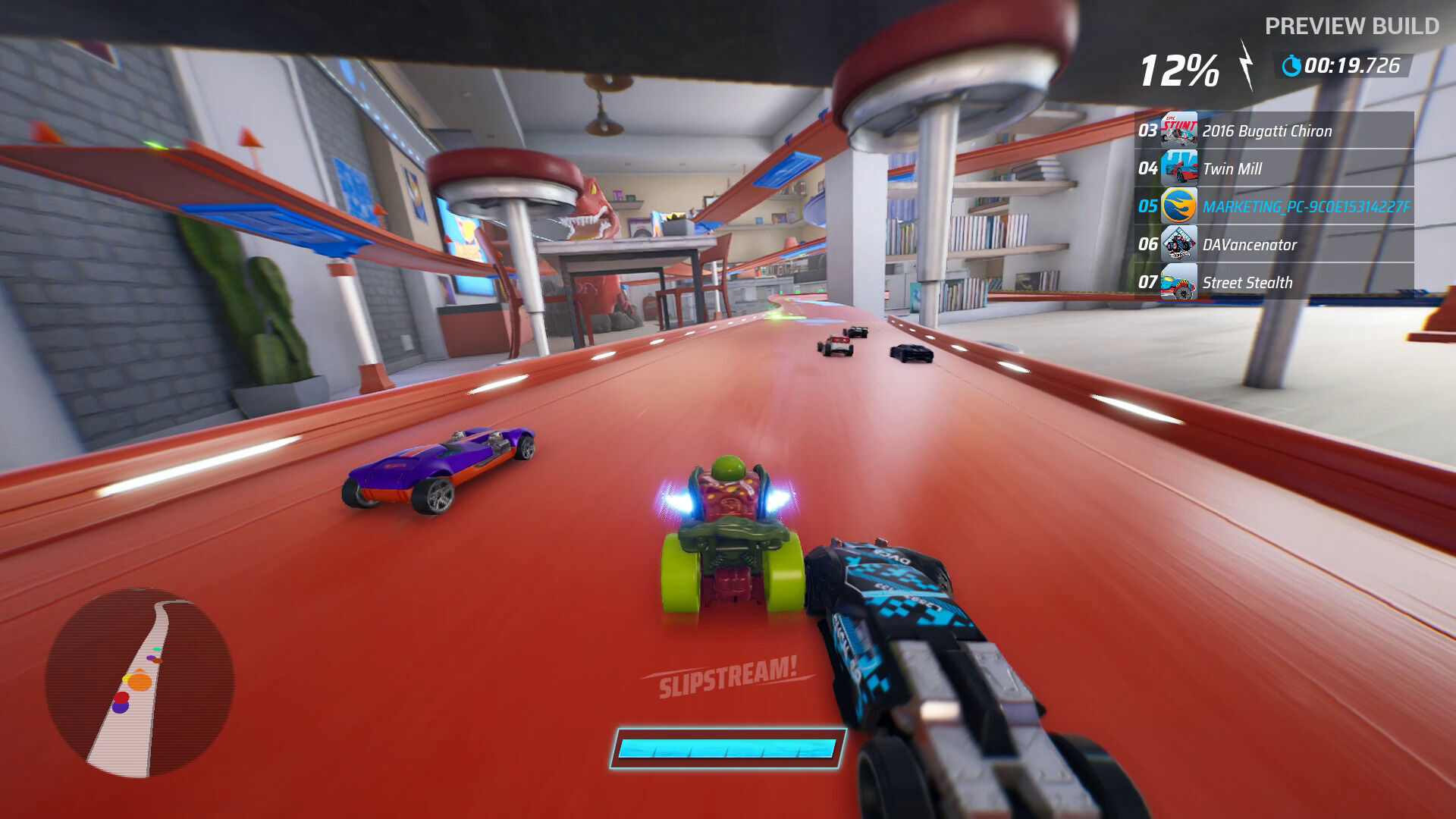 Como en el título de 2021, las distintas pistas se ambientan en varios entornos compartidos, como un salón o un garaje. Aquí hemos visto dos inéditos: un minigolf y un jardín, a los que habrá que sumar otros cuatro (un salón recreativo, una gasolinera, un museo prehistórico y una track room vacía para crear nuestras pistas). Como podéis imaginar, conducir por la hierba, la arena o el barro es distinto a hacerlo sobre el parqué, el cemento o las pistas naranjas y azules de Hot Wheels, así que habrá que pensarse mejor qué vehículo elegir para cada circuito y para cada prueba.