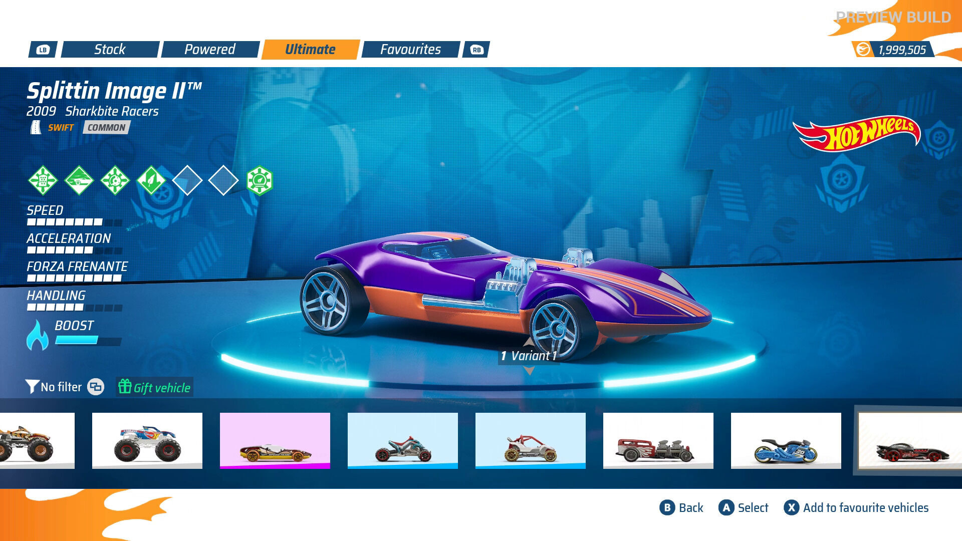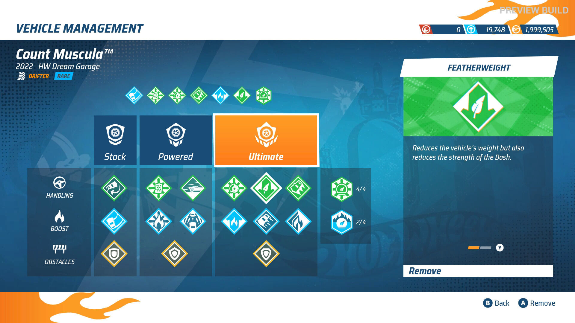La cantidad de espacios para las ventajas, y la potencia de las mismas, depende del nivel de vehículo, casual, rookie y pro; se puede pasar de una a otra usando un kit de mejora. Además, tienen rareza. De manera similar a los Forza, los hay de cinco categorías diferentes. Otra cosa que han extraído de esa saga (y que a su vez se ha visto en muchas otras): la ruleta para conseguir más bólidos, aquí, repetimos, sin microtransacciones. Además, hay una tienda que funciona con la moneda del juego y que se actualiza diariamente.