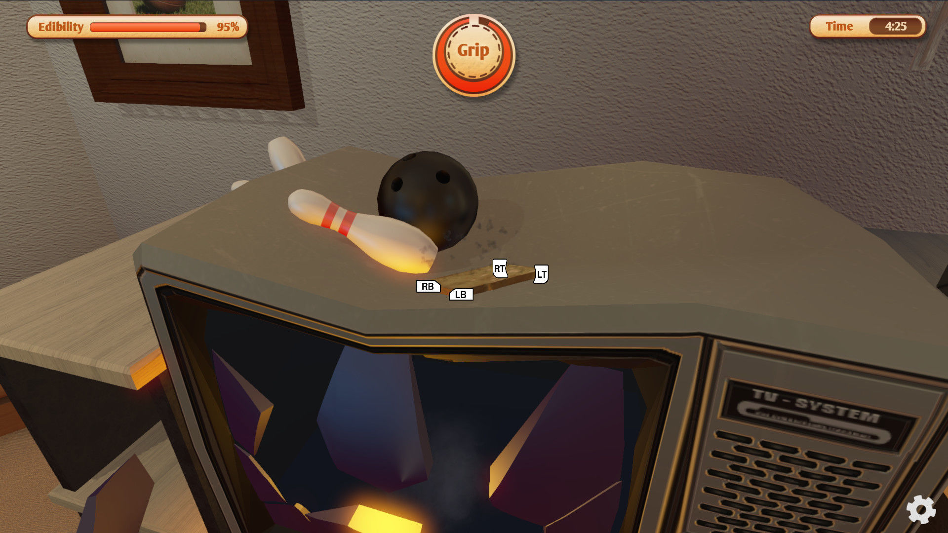 El control es relativamente tosco, pero principalmente porque necesita una coordinación enorme hasta que nos acostumbremos a él. Podemos jugar con mando –algo que probablemente agradezcáis si habéis jugado al mencionado Octodad: Dadliest Catch, o incluso sin haberlo jugado–, pero también podemos jugarlo con teclado y ratón. El mayor problema al que nos enfrentaremos será sincronizar nuestras pulsaciones de botones para realizar el recorrido necesario sin perder el agarre, ya que, como señalábamos previamente, la rebanada tiene un límite de "fuerza" para sujetarse a una superficie determinada, y la gravedad hace su trabajo rápidamente.