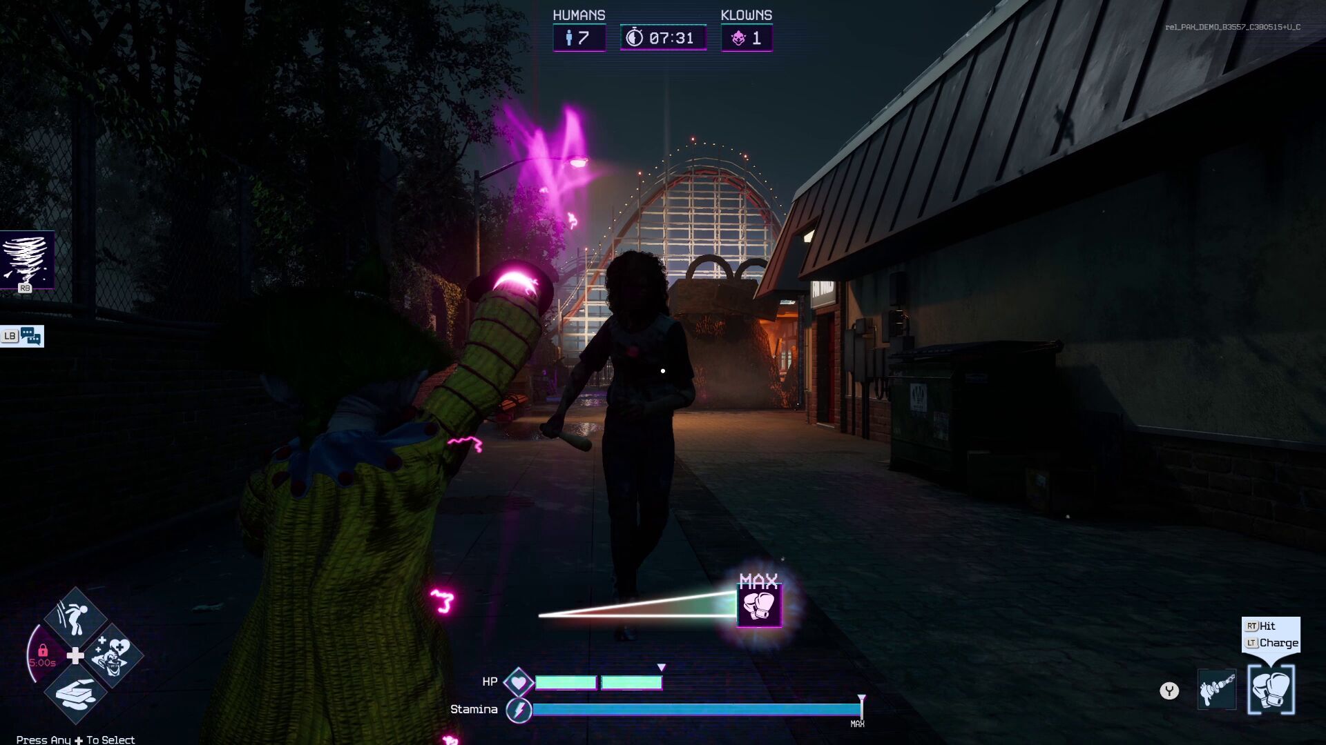 En el caso de que nos toque jugar como un payaso, dispondremos de un arma estándar que sirve para convertir en algodón de azúcar a nuestras presas, encerrándolas así en un capullo que podremos transportar hasta algunas de las perchas que hay repartidas por el escenario. Si pasados unos segundos nadie rescata a nuestra víctima, esta morirá y el medidor del apocalipsis aumentará. Si este llega al máximo, la partida acabará antes de tiempo y ganaremos automáticamente.