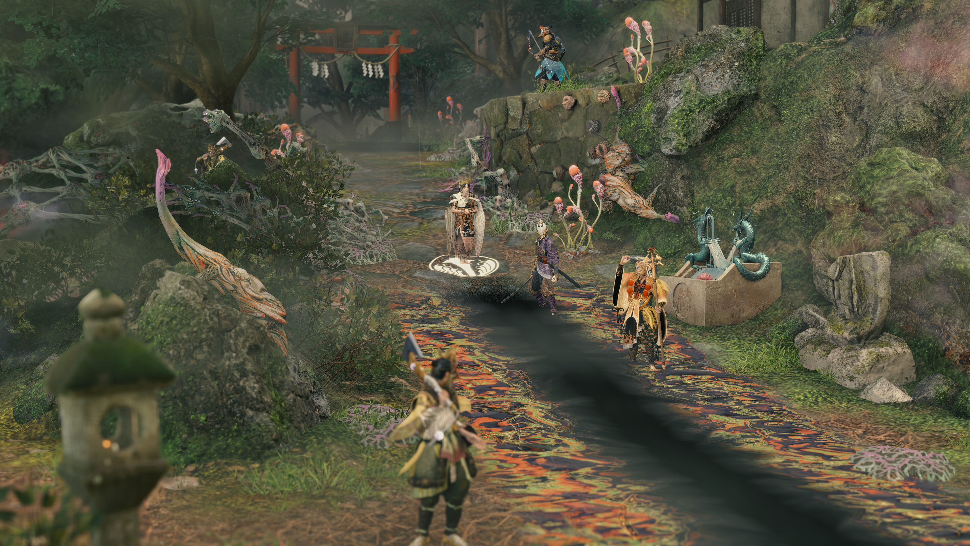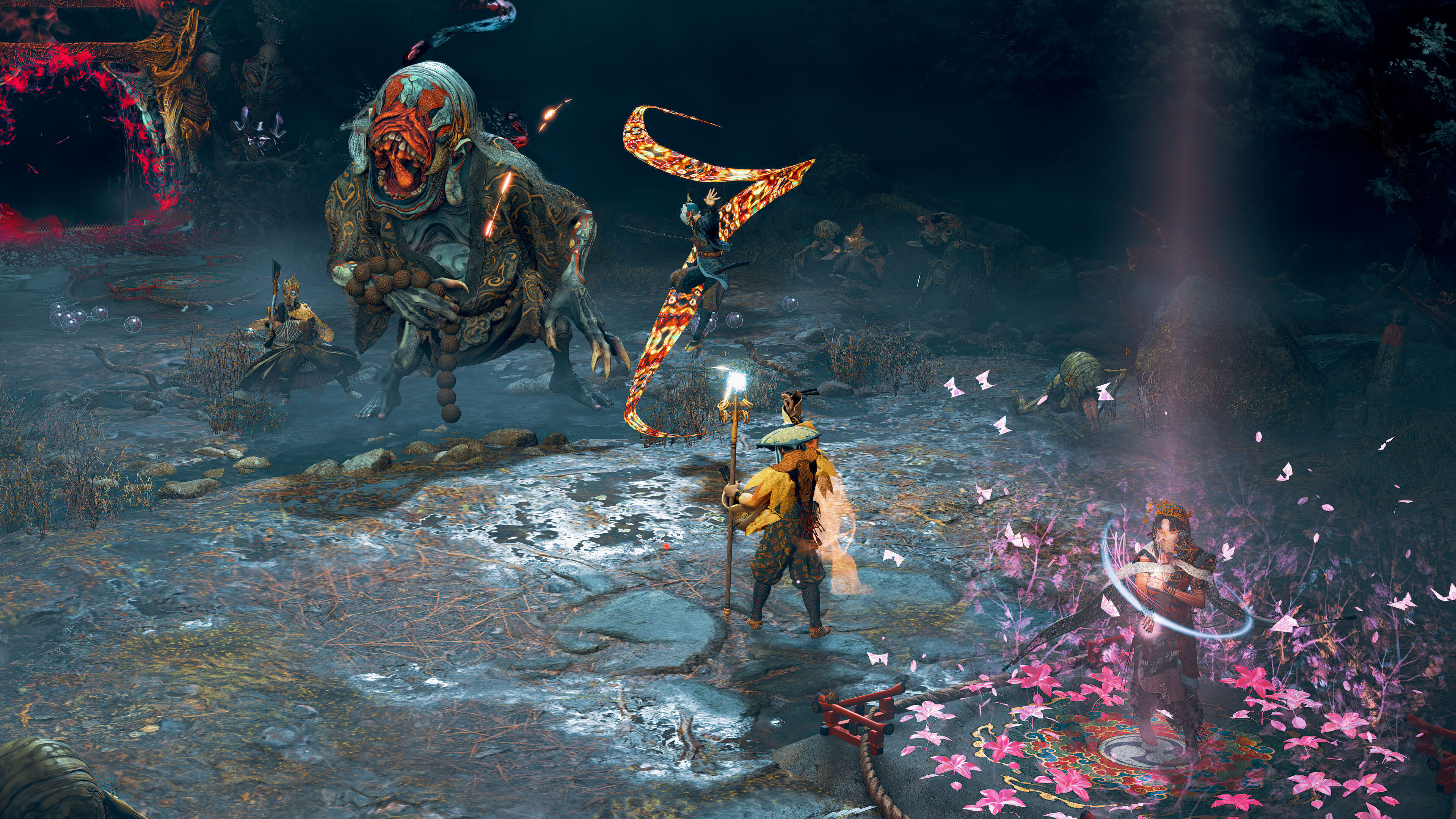Si entramos en el detalle de esa mesita es porque nos parece muy representativa del cuidado artístico de Kunitsu-Gami, de la atención al detalle, de lo precioso que resultará para cualquiera atraído por la cultura japonesa. ¿Los pasteles que hemos mencionado? Son dulces escaneados, cocinados en una pastelería real de Kioto, Tsuruya Yoshinobu, que lleva más de 220 años con las puertas abiertas. Los pueblos, con sus casitas, sus ríos y sus puentes, son dioramas también escaneados y después modificados para el juego. Las cuidadas vestimentas que llevan Soh, la sacerdotisa y los aldeanos se han confeccionado en la vida real para la ocasión. Es un videojuego precioso, pero también capaz de ponerse tenebroso, sobre todo con esas criaturas demoníacas de diseño horripilante y con la espectacular música, que nos pone los pelos de punta cada vez que llega la noche.